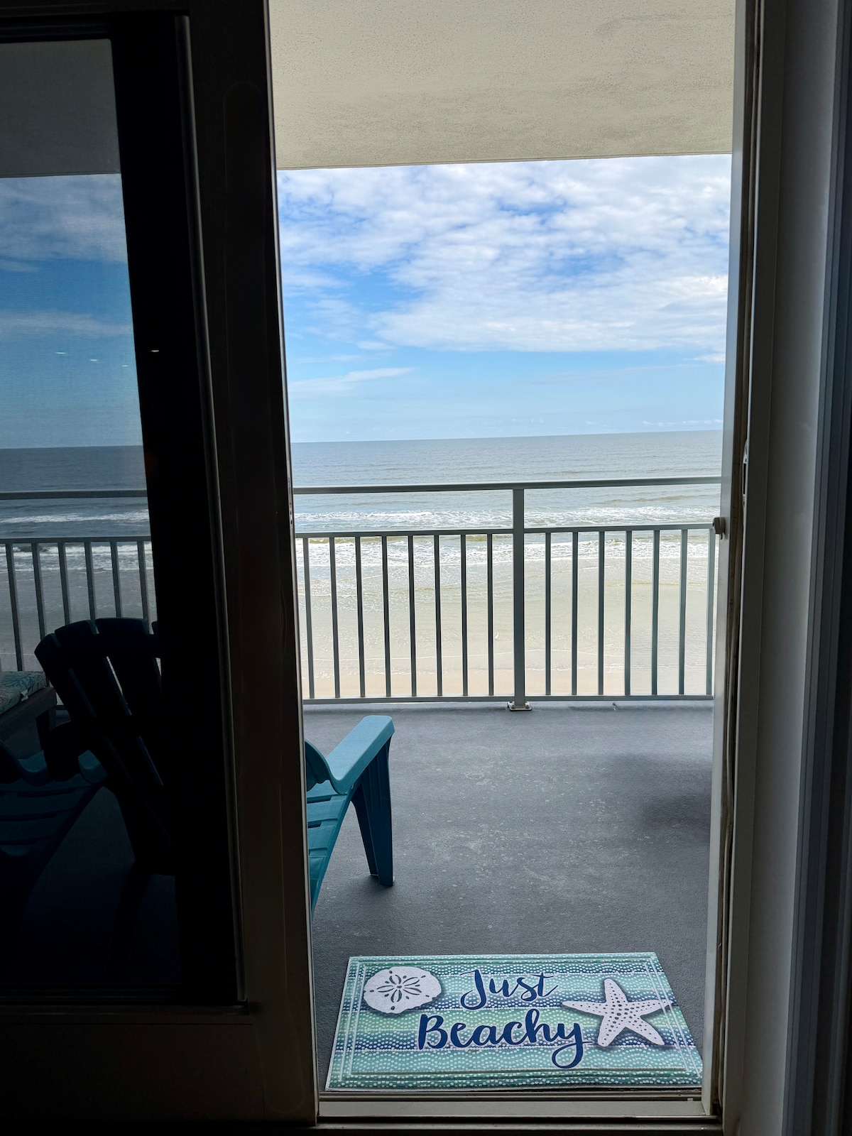 We are located on Daytona Beach a 1 minute walk through the pool area to be on the beach POOL IS OPEN AND INDOOR POOL IS OPEN Kick back and relax in our newly remodeled calm and stylish space. we have a full size refrigerator, you will fall in love with our balcony views. we have all pots and pans and kitchen supplies. all linens and beach towels included. we have 1 king bed and a futon couch big enough for 1 adult or 2 small children.