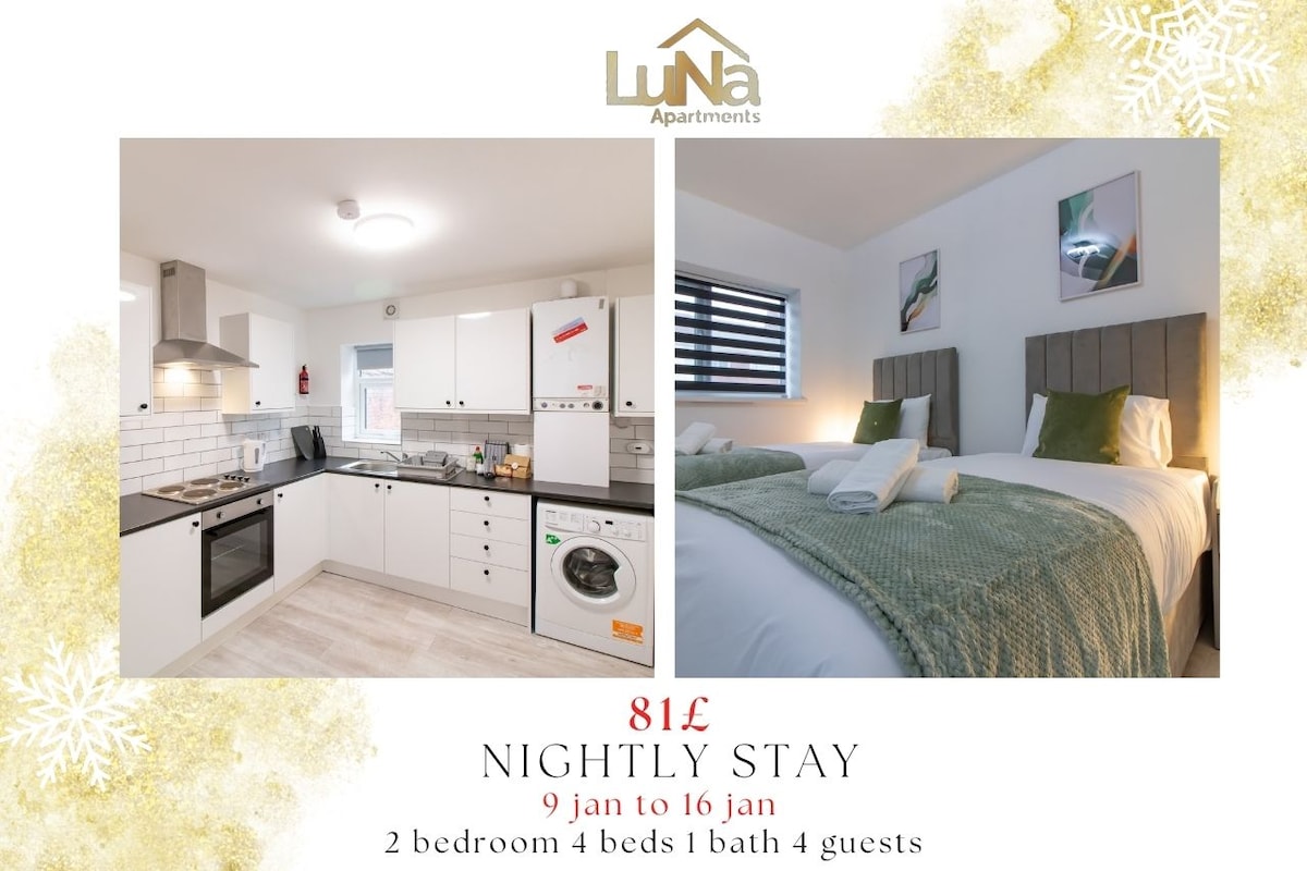 2BR Home Sleeps 4 - £78/Night for Families & Work