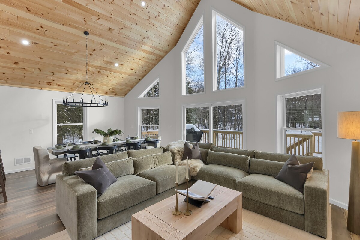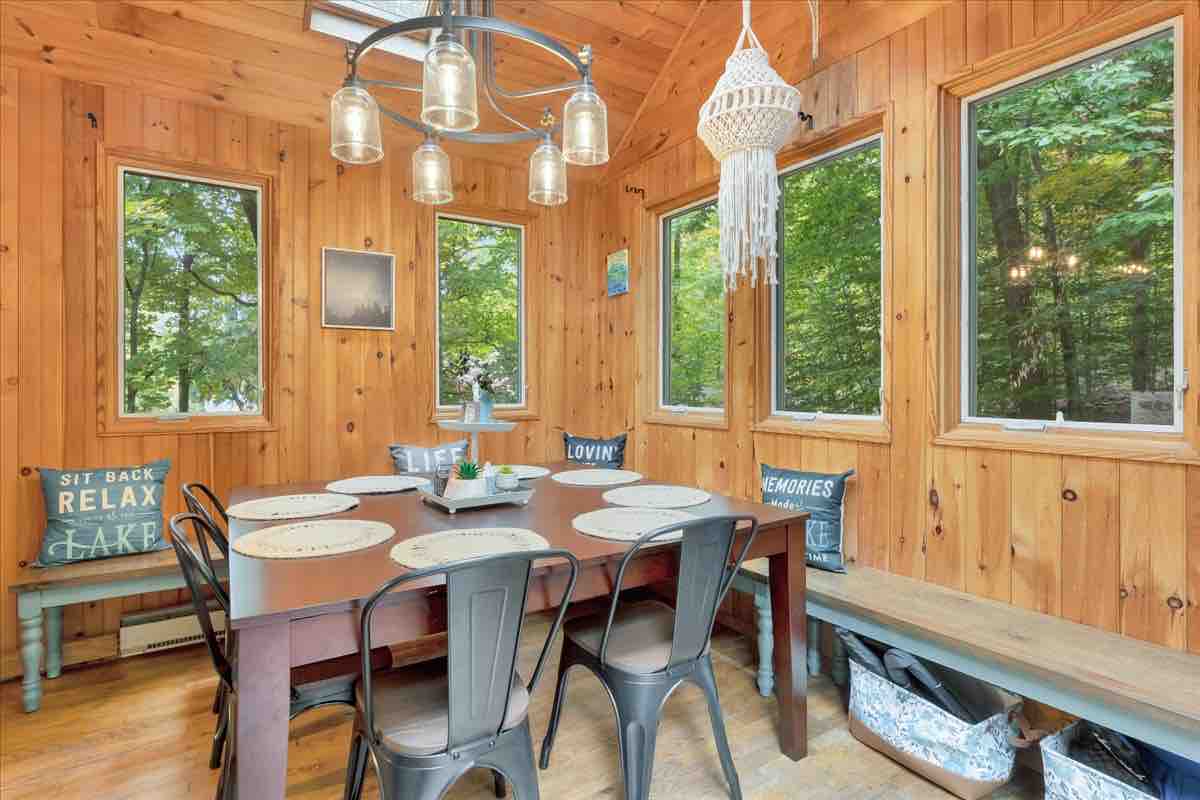 Escape to our spacious winter cabin, surrounded by a peaceful forest backdrop and often blanketed in snow, with warm holiday décor inside. Enjoy cozy indoor and outdoor seating, a hot tub in a private gazebo, porch swing, hammock, and a crackling fire pit for starlit nights. Inside, an open-plan living area, games, and comfy bedrooms await. Minutes from cute restaurants, skiing, lakes, and trails—perfect for relaxing and soaking in the charm of the Poconos.