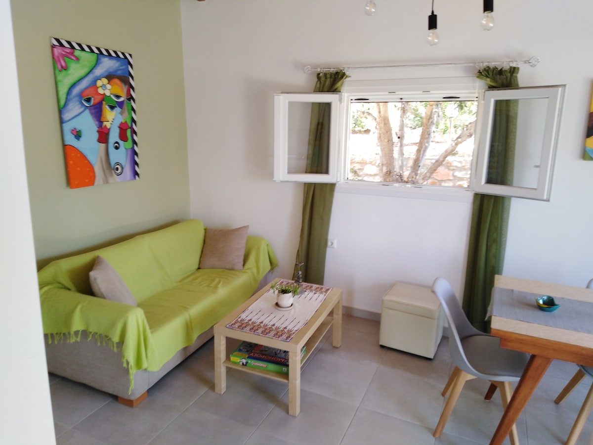 Laipni lūdzam jūsu personīgajā grieķu paradīzes daļā - tikai 50 m attālumā no jūras, kur dārzs zied ar sauli mīlošiem kaktusiem, un vienīgais grafiks ir viļņu ritms. Šis stilīgais 2 guļamistabu bungalo ir ideāli piemērots pāriem, ģimenēm vai draugiem, kas meklē ne tikai mājokli, bet arī vietu, kur elpot. Komforts ir ērts, jo tajā ir privāta autostāvvieta, gaisa kondicionētājs un uzticams Wi-Fi. Tikai 1,2 km attālumā no šosejas, lai izpētītu salu bez piepūles.