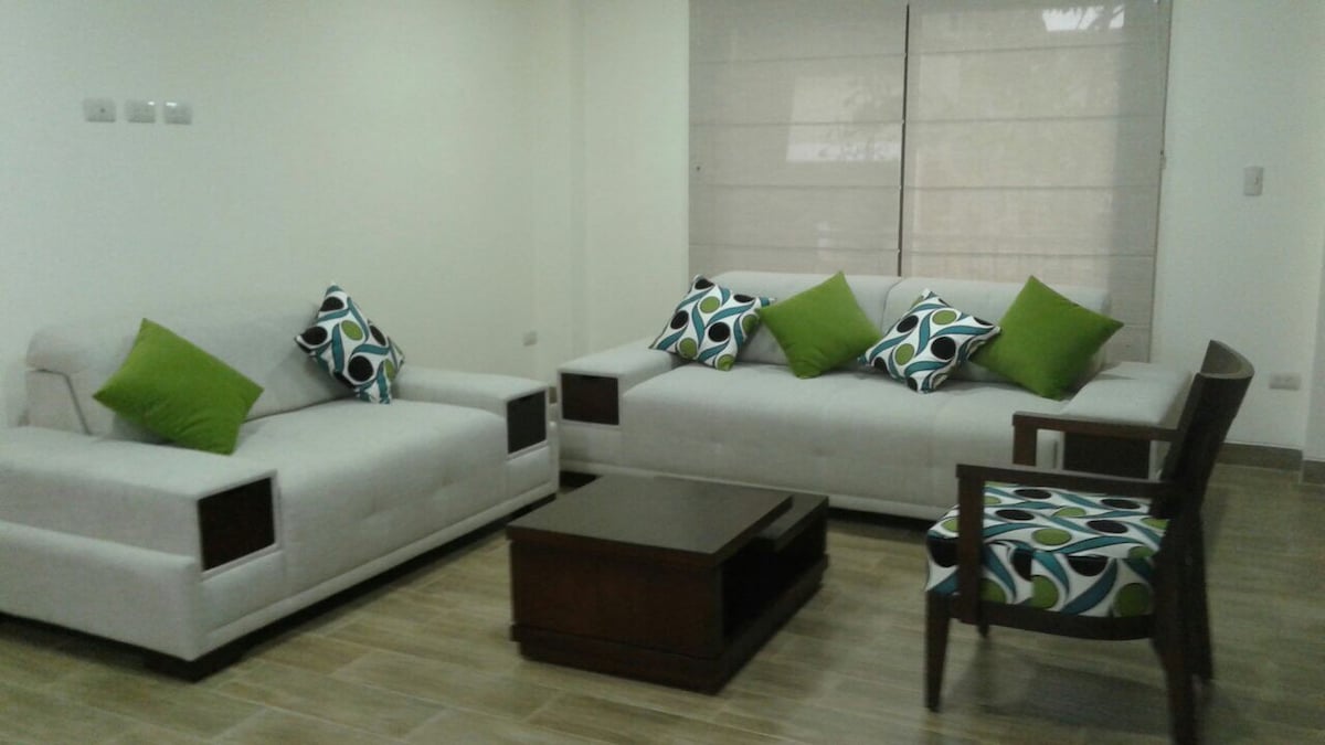Cozy brand new apartment located in the private sector, ideal for a stay for two people, near the El Dorado shopping center and several supermarkets, located 25 minutes from the Guayaquil airport, it has a private security guard, social area, gym and parks for children. The rental of the apartment is complete, it has air conditioning in the master bedroom, living room and dining room, refrigerator, TV and internet. It is perfect for couples and business trips.