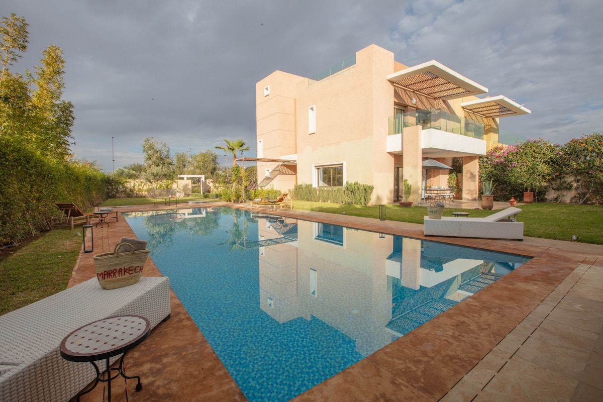 Villa située à 30 minutes de Gueliz dans un charmant domaine sécurisé 24/7 avec terrain de tennis commun et piscine privée. La villa se compose de 3 tres grandes suites avec chacune leur cheminée, leur télé (Netflix gratuit), 3 salles de bain, d'une petite piscine intérieure chauffée, d'une piscine extérieure privative et d'un jardin privatif sans vis à vis, d'un salon avec cheminée. Table à manger convertible en billard et en table de ping-pong. Idéal pour se détendre au calme.