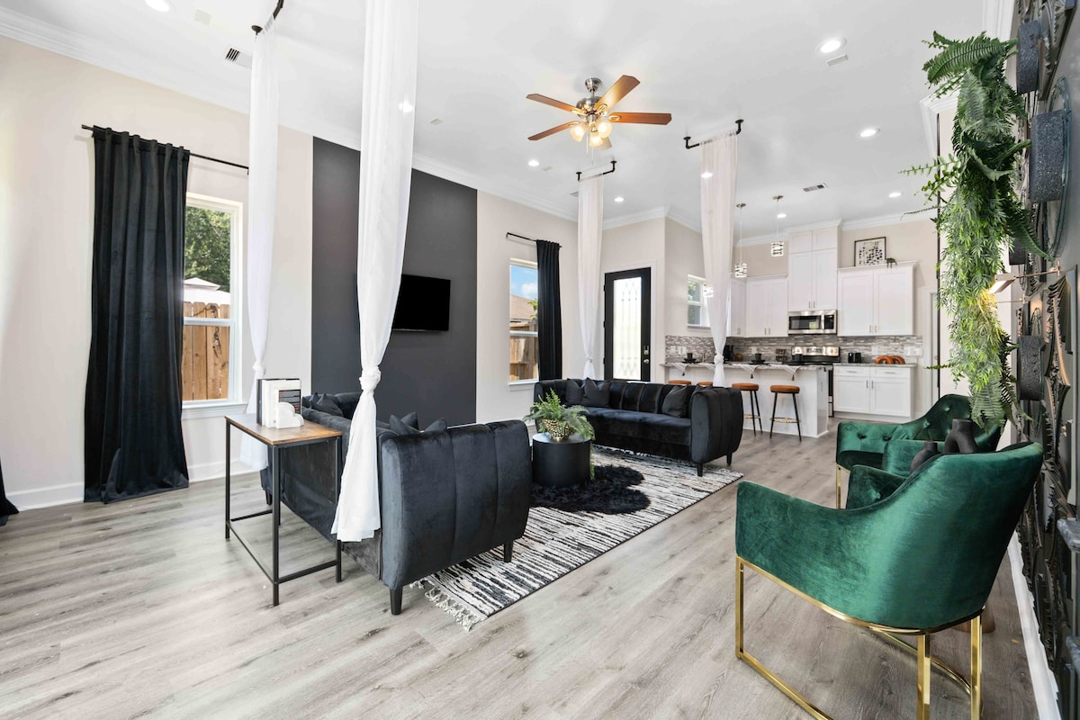 Izbaudiet greznību šajā Hjūstonas rindu mājā ar 3 guļamistabām, katrā no tām ir privāta vanna/televizors. Viedajā mājā ir automatizētas slēdzenes, gaismas, putekļsūcēji un termostati. 2. stāvā ir atvērta tipa telpa ar virtuvi, ēdamistabu un dzīvojamo zonu, kurā ir 85collu Samsung televizors, baseina galds, galda spēles un mini bārs. Apakšstāva guļamistabā ir neliela darbstacija un biroja telpas ar pilnu darba aprīkojumu. Izbaudiet pagalma atpūtas zonu. Atrodas mazāk nekā 5 jūdžu attālumā no NRG stadiona un Minute Maid parka.