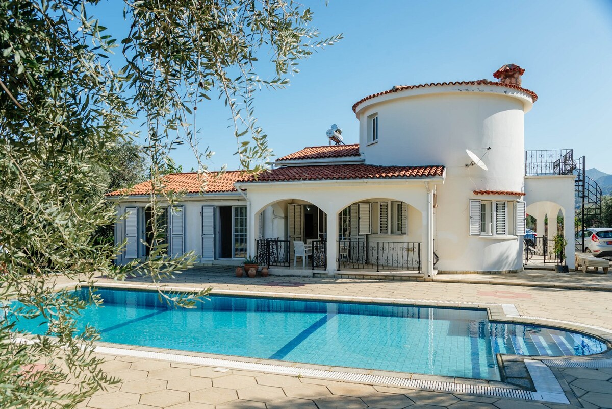 Satriecoša 4 guļamistabu villa ar skatu uz jūru un privātu 5x10 m baseinu Katalköy (Agios Epiktikos), Kirēnijas ekskluzīvākajā reģionā. Centrālā: netālu no tirgiem un kafejnīcām; slimnīcas un senās ostas tuvumā; daudzas pludmales 5–10 min ar automašīnu. Galvenā guļamistaba ar vannasistabu, vannu un ieeju skapī; vēl viena istaba ar vannasistabu; kopīga vannasistaba un papildu tualete. Plaša viesistaba, pilnībā aprīkota virtuve (2 ledusskapji, trauku mazgājamā mašīna, veļas mazgājamā mašīna), Wi-Fi un gaisa kondicionētājs katrā istabā, kas iekārtots labiekārtotā dārzā ar augļu kokiem.