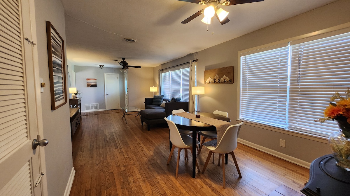 Atpūtieties un uzlādējieties šajā Dentonas centrā esošajā mājoklī. Pastaigas attālumā no visiem iepirkšanās un ēdināšanas centriem, ko piedāvā vēsturiskais centra laukums, kā arī Ziemeļteksasas Universitātei un Teksasas Sieviešu universitātei, mūsu mājoklis ir gaišs un mierīgs ar divām atsevišķām guļamistabām, pilnu vannasistabu ar vannu un dušu, spēļu istabu, pilnu virtuvi, veļas mazgātavu, pagalmu ar ugunskura vietu un svarīgo Dentona priekšpagalmu, lai vienkārši sēdētu un vērotu pasauli.