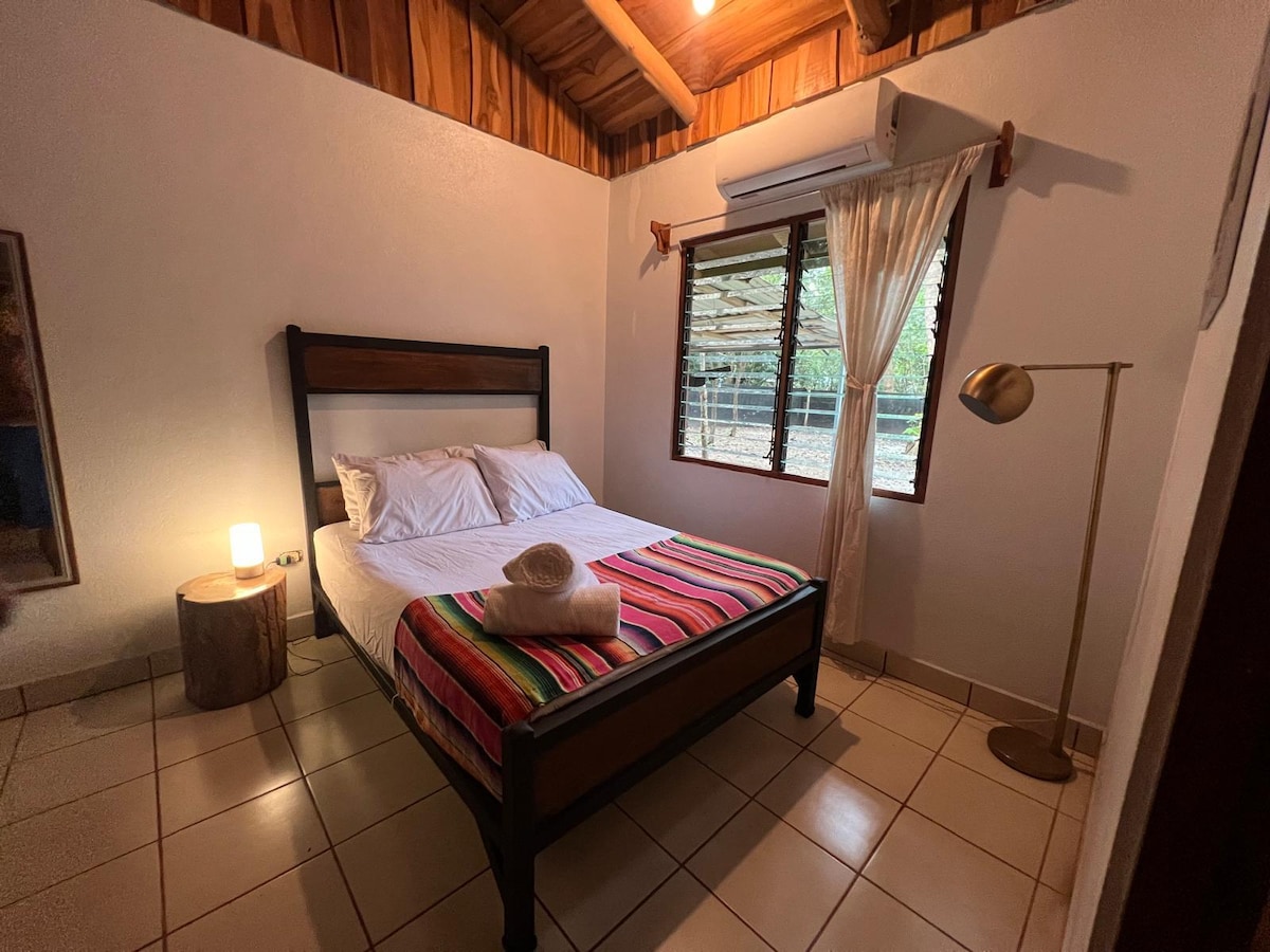 Skaists Nosaras dzīvoklis, tikai 3 minūšu pastaigas attālumā no pludmales, jogas un sērfošanas. Izbaudiet dzīvojamo istabu ar dīvāngultu, pilnībā aprīkotu virtuvi un balkonu ar skatu uz koplietošanas baseinu un dārzu. Guļamistabā ir divguļamā gulta, gaisa kondicionētājs un ar rokām darinātas Kostarikas koka mēbeles. Uzturiet sakarus, izmantojot ātrdarbīgu Wi-Fi, viedtelevīziju un īpašu darba galdu. Atrodas klusā ielā, kur pamanīsiet putnus, pērtiķus un vāveres, taču soļu attālumā no tādiem populārākajiem restorāniem kā La Luna, El Chivo, Olgas un citi.