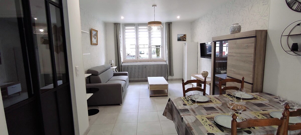 Logement entièrement rénové, cette dépendance au sein de notre corps de ferme conserve le cachet de l'ancien avec poutres apparentes dans une ambiance cosy et chaleureuse. Au cœur d'un village avec toutes commodités : boulangerie, boucherie charcuterie, supérette, pharmacie … Le logement offre de beaux volumes, avec cuisine équipée, 2 chambres, salle de bain avec douche et espace buanderie avec machine à laver. Bel espace extérieur aménagé et partagé en commun avec nos hôtes. Equipements bébé.