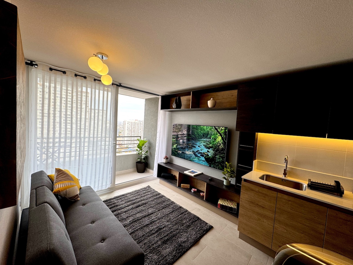 Izcila apkaime, centrāla, droša un skaista. Pastaigas attālumā no COSTANERA CENTRA, MUT, INDISA klīnikas, GONDOLAS, iepretim SKULPTŪRU PARKAM. Ideāli piemērots ilgtermiņa uzturēšanās laikam, tajā ir viss nepieciešamais. Tajā ir liela guļamistaba ar “King” izmēra gultu, liels skapis, 4K UHD televizors, Wi-Fi bez ierobežojumiem, vannasistaba ar dušas durvīm, veļas mazgājamā mašīna ar žāvētāju, dvieļi, fēns un minivirtuve, kas aprīkota ar sadzīves tehniku un piederumiem. Tuvumā atrodas bāri, valūtas maiņas punkts, kafejnīcas, restorāni. Skatiet ceļvežus manā profilā.