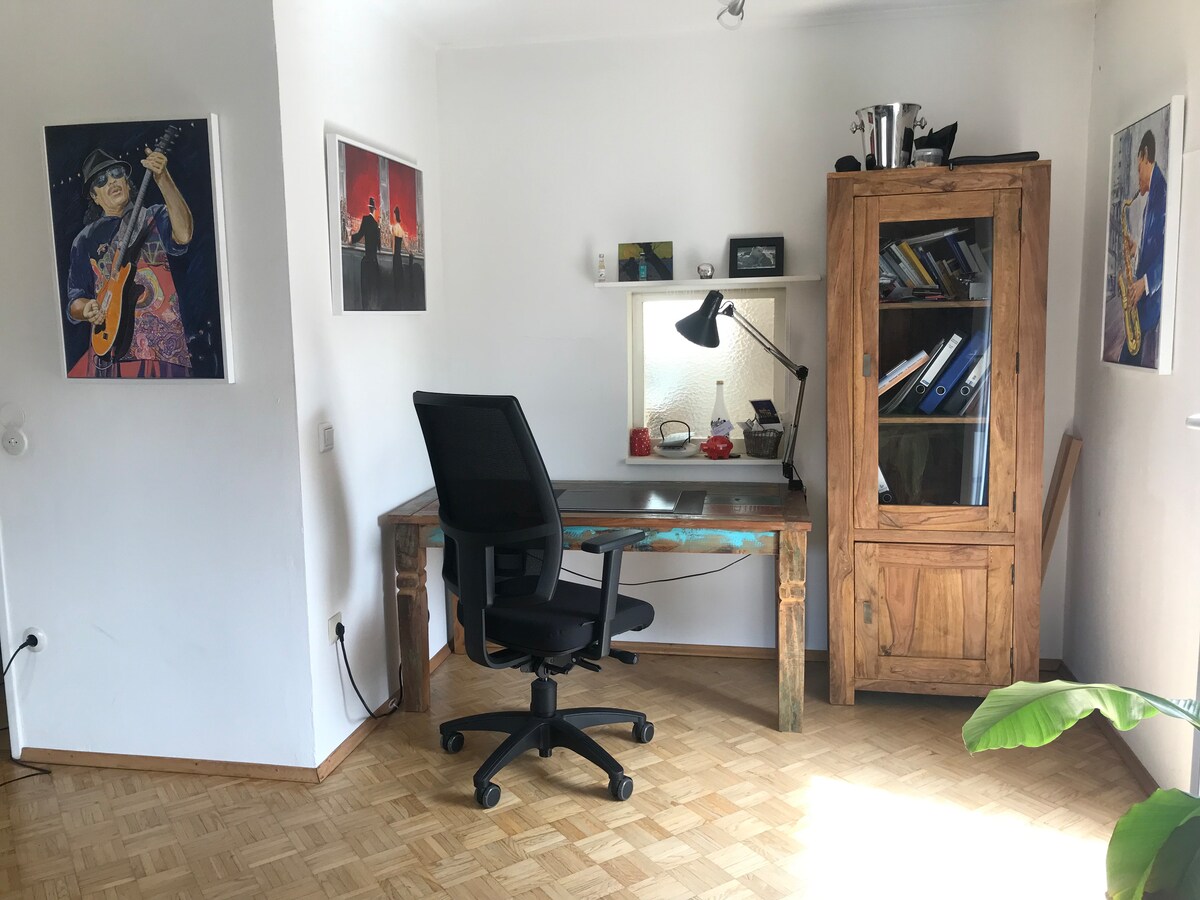 Mūsu divistabu dzīvoklis atrodas ļoti klusā vietā, savrupmājā ar atsevišķu piekļuvi. Dzīvoklis ir liels un gaišs, un tam ir 40 kv.m terase. Virtuve ir pilnībā aprīkota. Pastaigas attālumā atrodas iepirkšanās un restorāni. Neatkarīgi no tā, vai gadatirgus, pilsētas centrā, Ziemassvētku tirdziņš vai dzelzceļa stacija. Ne vairāk kā 20 minūšu laikā varēsiet nokļūt galamērķī ar autobusu vai S-Bahn. Ja jums ir nepieciešama atpūta, pastaiga vai skriešana, jūs atradīsiet daudz dabas tieši pie jūsu namdurvīm.