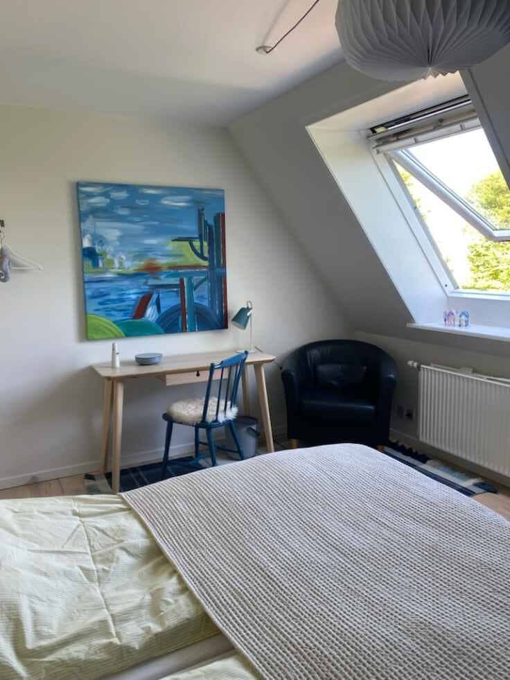 Dzīvoklis līdz 6 cilvēkiem + bērniem. Privāta ieeja un vannasistaba. Divguļamā gulta 140x200 cm + jaunākā gulta (140 cm) Papildu istaba 2. stāvā: divguļamā gulta (180x200 cm) + 2 vienguļamās gultas (70x200). (Pieejams, ja > 2 pieaugušie). Ir neliela jauna virtuve ar cepeškrāsni, 2 plītīm, trauku mazgājamo mašīnu, ledusskapi un kafijas automātu (bezmaksas kapsulas). Ir bezmaksas piekļuve dārzam, gāzes grilam, vienkāršai āra virtuvei un ezeriem. Makšķerēšanas licenci var iegādāties tiešsaistē par 50 kr. Atrodas ainaviskā apkārtnē starp 2 ezeriem, netālu no Odenses.
