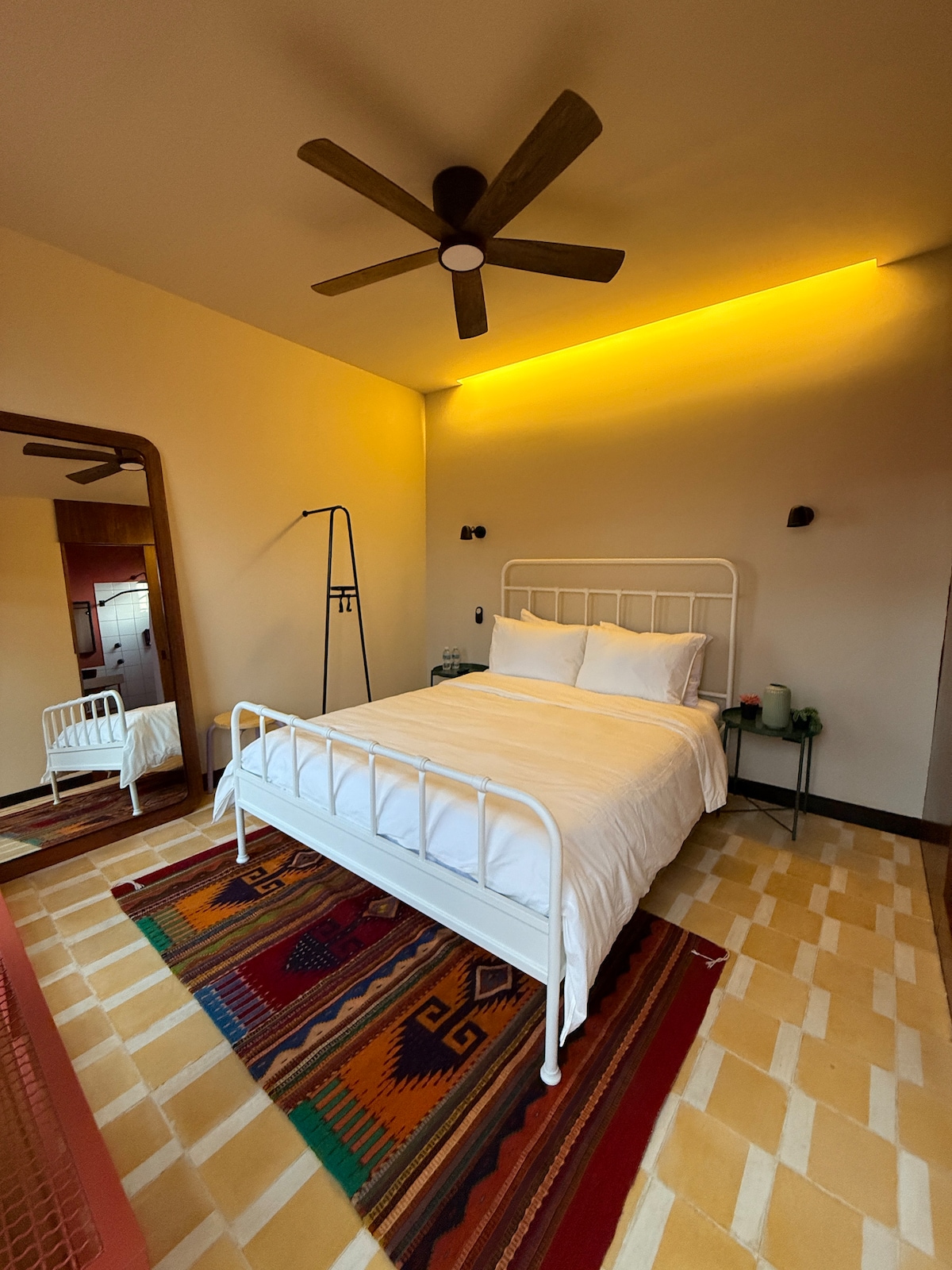 Privāta istaba ar "memory foam queen" gultu, pilnībā aprīkotu vannasistabu, rakstāmgaldu, gaisa kondicionētāju, kafijas automātu, ūdeni, gaisa kvalitātes sensoru un mini ledusskapi. Piekļūstiet terasēm ar burbuļvannu, gultām, aprīkotu virtuvi un brīnišķīgiem skatiem. Mums ir ierīces, kas mēra gaisa kvalitāti katrā telpā jūsu komfortam un drošībai. Atrodas pašā Ksočimilko sirdī, soļu attālumā no kafejnīcām, restorāniem un pilsētas mākslas.
