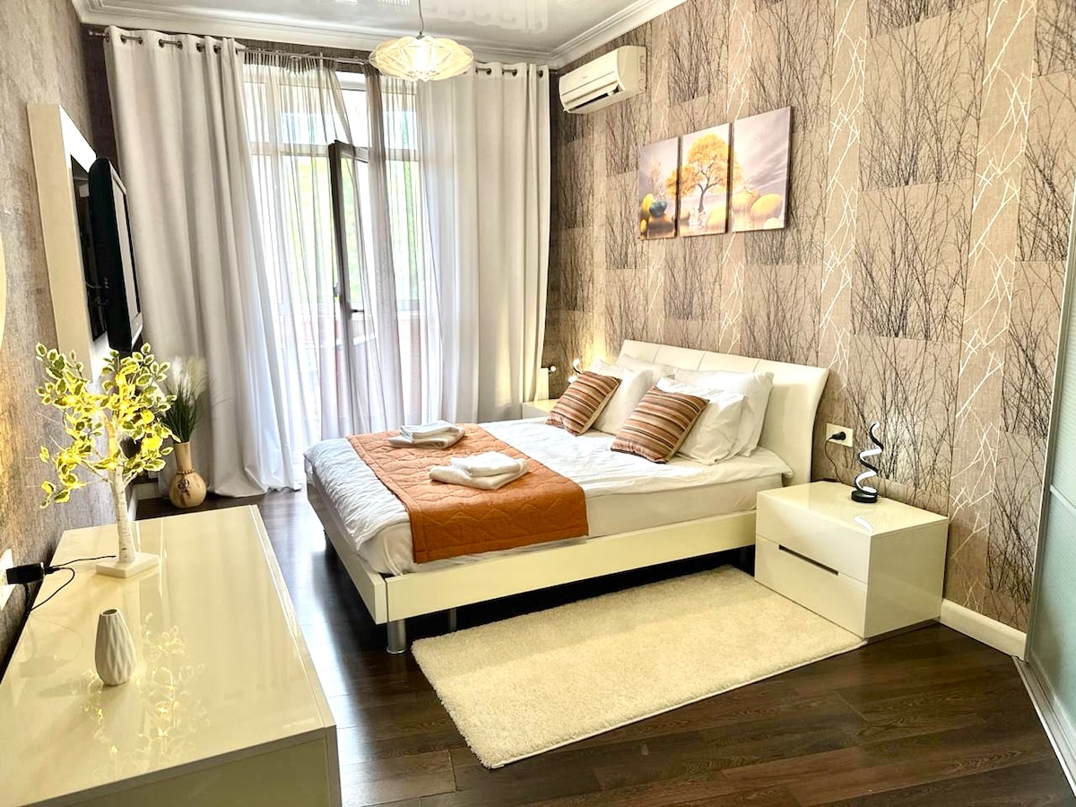 Dzīvoklis atrodas pilsētas centrā. Deribasivska iela, Operas teātris, Katerynynska laukums un visi labākie restorāni Odesā atrodas pastaigas attālumā. Dzīvokļa kopējā platība ir 50 m2. Dzīvoklis izgatavots ar dizaineru veiktajiem remontdarbiem. Uzstādīts ātrgaitas internets, Wi-Fi internets un TV. Gaišā, elegantā virtuve aprīkota ar skaistām iebūvētām mēbelēm un sadzīves tehniku, ūdens filtru, kafijas automātu. Viesistabā ir liela dīvāngulta un televizors, Smart TV, gaisa kondicionieris, skapis. Guļamistabā - king size gulta, televizors, Smart TV, gaisa kondicionieris, garderobe, ieeja uz balkonu. Vannas istabā ir dušas kabīne, veļas mašīna. Karstais ūdens ir pieejams visu diennakti (autonomā apkure). Tuvumā ir daudz veikalu, autostāvvieta maksas autostāvvietai.