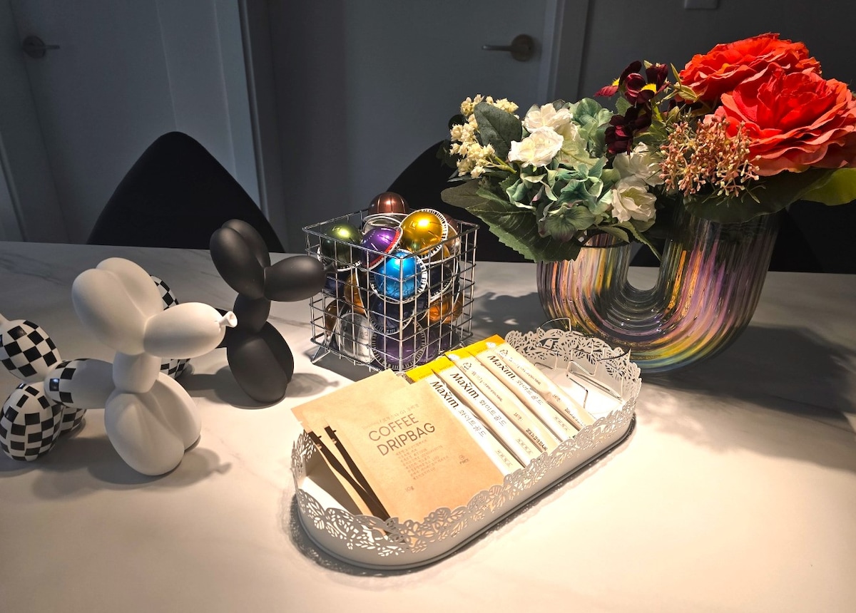 Hello, it is located in Songjeong district of new city, 5 minutes drive from Ulsan Airport. It is a clean and spacious house with three high ceilings. It is a new building, and everything is equipped with new products. There is a terrace on the back of the hotel where you can freely barbecue.