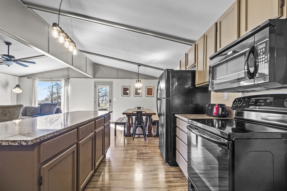 Izklaide un atpūta laukos, brīvdienu ugunskurs? Šī ir ideāla vieta jūsu ģimenes atpūtai. Aizmirstiet par savām raizēm, klejojot pa šīs mierīgās lauku vides akriem. Trīs guļamistabas, divas vannasistabas, plašs mājoklis ar lielu pilnu virtuvi uz 5 mierīgiem akriem ganību zemes, tostarp bērnu rotaļu māja un šūpoles. Nožogots ar pagalma ugunskura gredzenu. Ātrgaitas WI-FI. Tuvumā ir piekļuve upju un ezera laivošanai un makšķerēšanai. Autostāvvieta ir plaša, tajā ir pietiekami daudz vietas otram transportlīdzeklim un laivas piekabei.