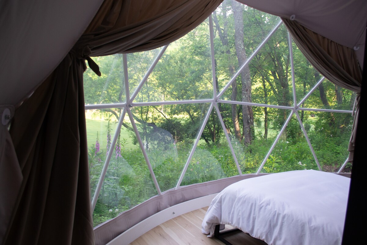 Stargazer Glamping Dome ir ideāla atpūtas vieta, kur izbaudīt dabu ar visām greznajām papildērtībām. - Stargazer jumta loga virsma - Atvērts visu gadu un gaisa kondicionētājs - Atrodas 7 nošķirtos akros. - Tieša piekļuve Mohikas upei - Privāta burbuļvanna - Pilnībā mēbelēta terase ar ugunskura vietu - Pilnīgi aprīkota virtuvīte - Projektors ar Roku straumēšanai - Starlink WI-FI - Luksusa vannasistaba - Gleznaini skati uz mežu un upi - Bruģēta autostāvvieta - 1,6 milj. no Sapņu tilta/Mohikanas ielejas takas