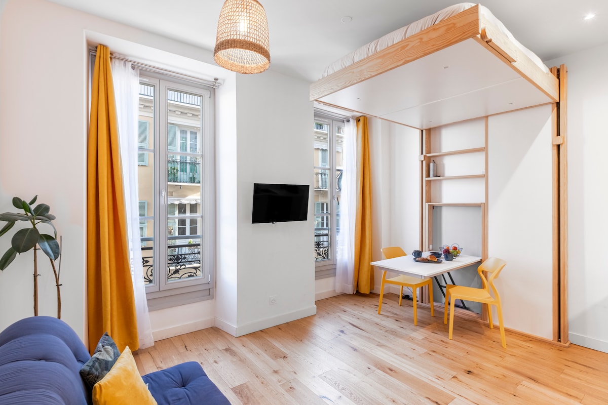 Very bright and cozy loft nested on last (6th US) floor with a lift in an historic building (with a lift) just a stone-throw from the Old Harbor. The unit is oriented East and offers unobstructed views on the Old Harbor, Cap de Nice and the sea that you can enjoy from the patio, the sofa, the dining table or even your bed. The location can't be better - beaches, La Promenade, Old Town and all amenities are just 5 min walk. The unit is accessible from the airport with Tram Line 2.