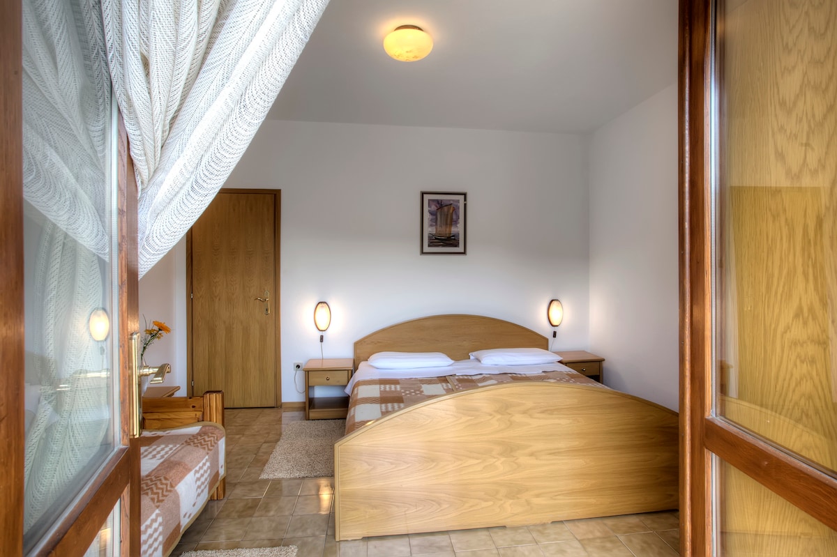 Apt. "Olive": Studio apartment for 2 + 1 persons with a terrace and a beautiful view. The apartment has a double bed and an extendable sofa, table and chairs for each person, kitchen utensils, pots, cutlery etc. A refrigerator and an electric stove with 2 hotplates are used for storage and preparation of food. Bathroom with toilet, shower and bath towels available. Distance to stone beach is 100m and 250m to gravel beach. Parking reserved at no additional charge! Free Wi-Fi! Air condition!