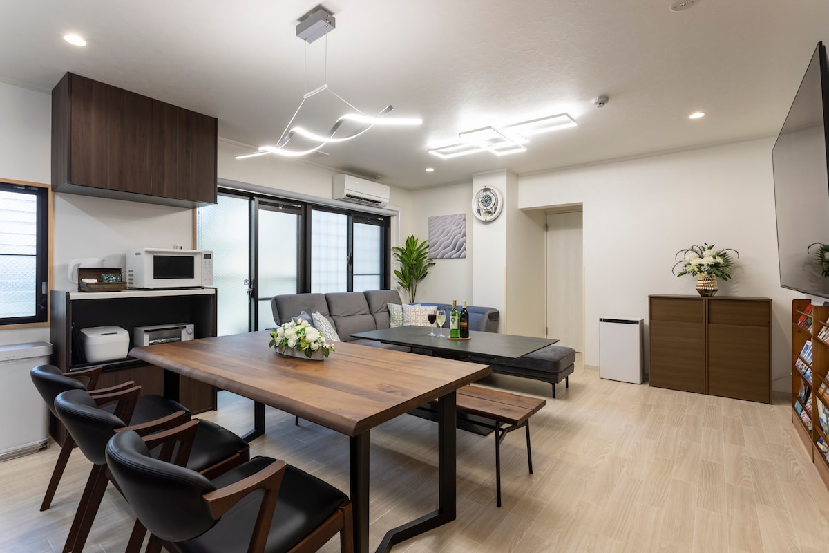 ★ Private 3BR House with Rooftop Sauna & Open-Air Bath|USJ 10min This 131㎡ home accommodates up to 10 guests and is just 0 min from Kujo Station-leading to USJ (10 min). Enjoy the rooftop sauna and open-air bath after a day out. The game room includes billiards, air hockey, and darts. Wi-Fi, kitchen, washer/dryer, and parking are available—ideal for families and groups. With 3 bedrooms and a spacious living/dining area, it’s perfect for relaxing stays in Osaka.