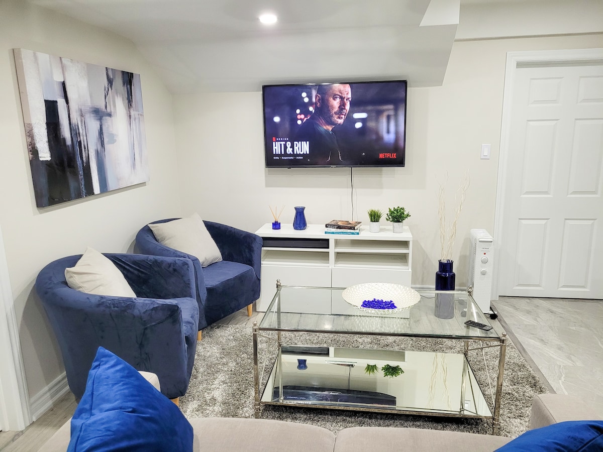 Bezmaksas autostāvvieta - Lieliska pitstop ceļojumiem gar 401 (izeja 399) - Atvērta koncepta telpa ar privātu vannasistabu - Divguļamā gulta (Queen), ātrs Wi-Fi un mini virtuves bārs - Iekļauta tējkanna, mikroviļņu krāsns un kafijas stacija - Mājīga darbstacija attālinātam darbam vai e-pastam - Ērta atrašanās vieta netālu no tranzīta, veikaliem un restorāniem - Pickering Casino (10 minūšu brauciena attālumā), Pickering Golf Club (2 minūšu brauciena attālumā), Bubble tea, Rollz Ice Cream, Good Life, Shawarma, Mexi Guac 4 minūšu brauciena attālumā - Mājīga ~200 kvadrātpēdu atpūtas vieta