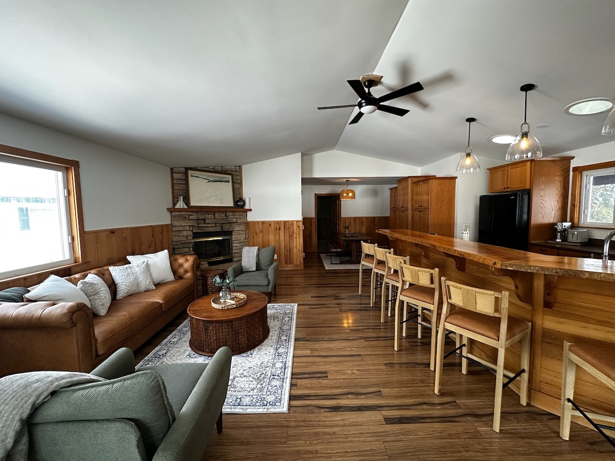 Sunrise Vista is a family-friendly destination located on all-sports Otsego Lake. Our newly-updated and professionally decorated home is located less than 15 minutes away from nearby golfing at Treetops, and just minutes from downtown Gaylord. Enjoy our lakefront property stocked with amenities such as kayaks, life jackets, a dock, & hot tub outside, with a fully stocked kitchen, games, new furnace and A/C, smart TVs, & shuffleboard table inside. There’s something for everyone at Sunrise Vista!
