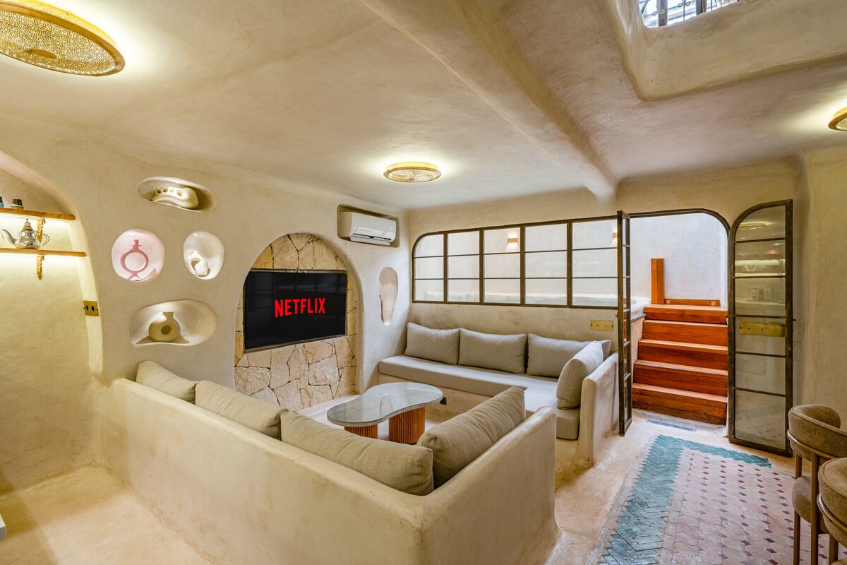 Piedzīvojiet "Le Petit Bacha" riādu Marakešā! Atrodoties pašā Medīnas sirdī, iegremdējieties dinamiskajā vietējā gaisotnē, dodoties uz mierīgu oāzi. Izbaudiet mūsu intīmo peldbaseinu uz jumta, atpūtieties gleznainajā terasē vai ienirstiet grāmatā no mūsu bibliotēkas. Lai iegūtu unikālu akcentu, pagrieziet istabu par kinoteātri ar mūsu Netflix gatavo projektoru. Labākie restorāni un apmeklējamās Medinas vietas ir tepat ap stūri. Priecāsimies jūs uzņemt!