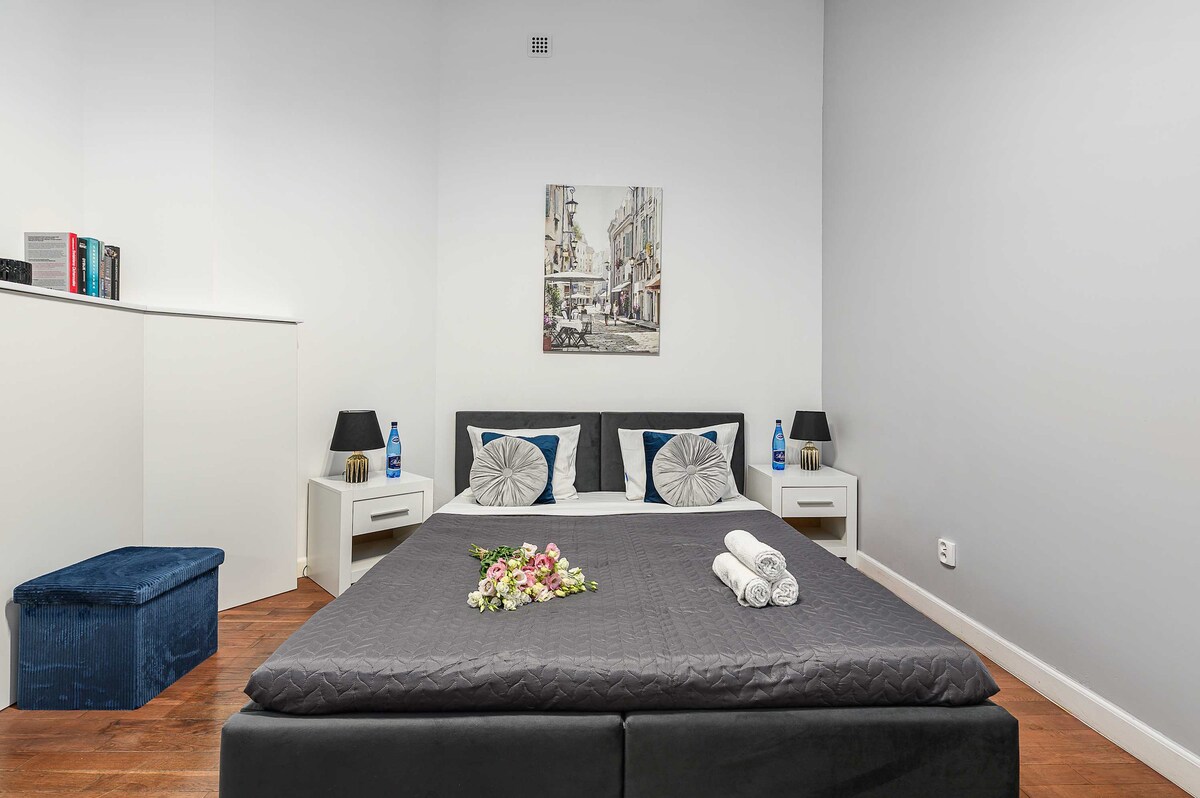 This spacious apartment features three comfortable rooms, making it ideal for families or groups of friends. The bright and airy living area is perfect for relaxing after a day of exploring the city The kitchen is fully equipped with all the essentials, allowing you to prepare meals with ease. You'll have the convenience of a dedicated parking space, making it easy to explore Łódź and its surroundings by car Our apartment provides the comfort and amenities you need for a delightful stay in Łódź