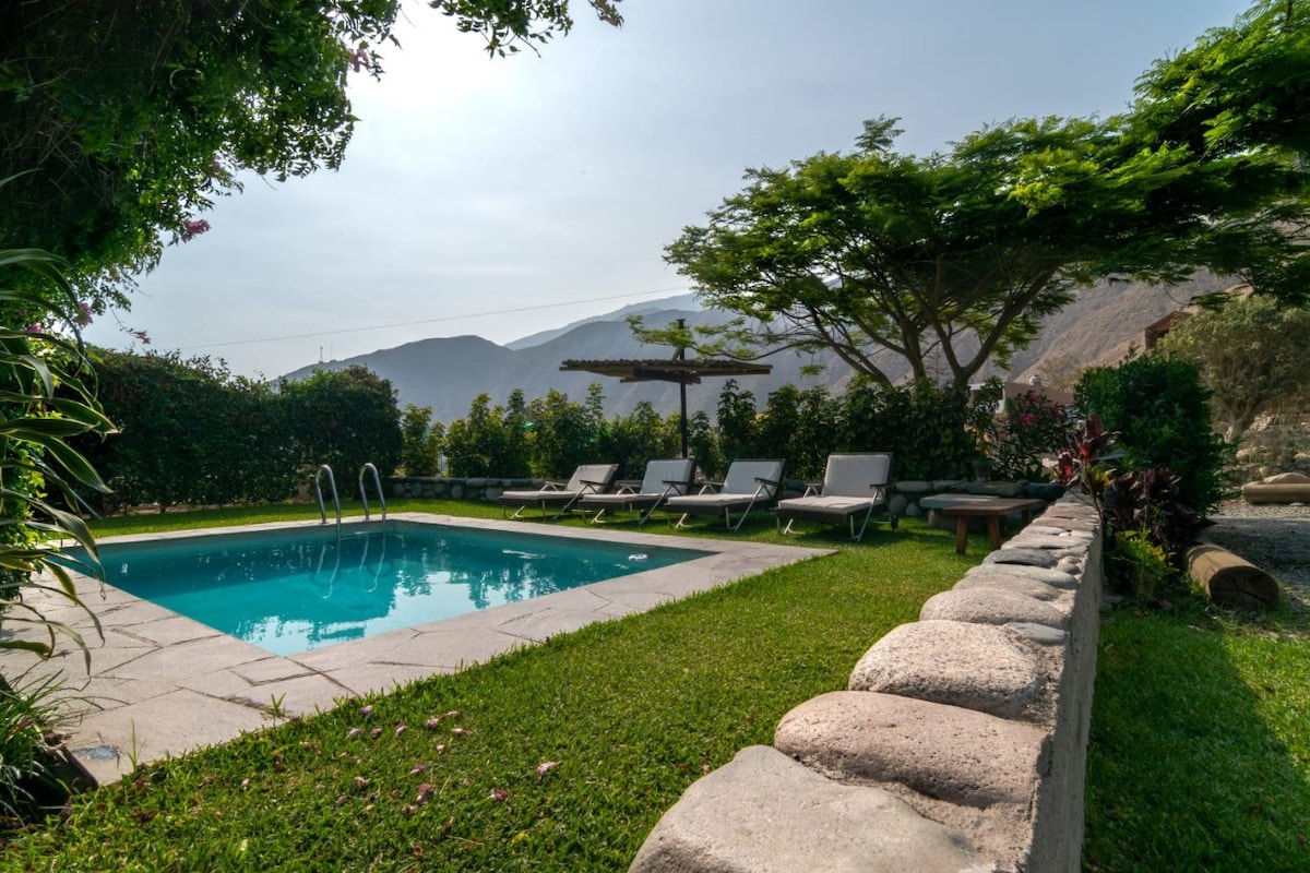 Ven y descansa unos días placenteros con toda la familia en este tranquilo lugar, a 10 minutos del ovalo de Cieneguilla. Área total de 1,000 m2, casa de campo con jardín, piscina de 9mx4m con luces y cascada, parrilla y área para juegos. TV de 75 pulgadas en sala principal con Directv . Sala de TV de 55 pulgadas. Internet. La piscina temperada tiene un costo adicional. Por normas del condominio, se solicitara lista de huéspedes nombres, apellidos edad ,DNI y placa de vehículos.