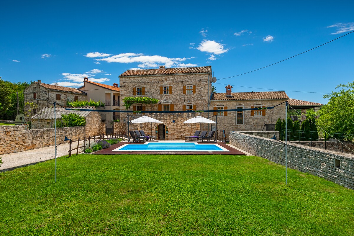 Tālu no ceļu trokšņa, atjaunota tradicionālā Istrijas stilā, divas savienotas ēkas, atsevišķas ieejas, kopā 12 personām. Ir pieejams baseins, 12 sauļošanās krēsli. Piemērots bērniem: šūpoles, batuts, galda teniss. Abās mājās pirmajā stāvā ir virtuve, ēdamistaba un dzīvojamā istaba, bet lielākās mājas augšējos stāvos ir 4 istabas; mazākās mājas 2 istabas, katra ar atsevišķu vannasistabu. Visas telpas ir aprīkotas ar gaisa kondicionētāju. Ārējā terasē ir galds ar krēsliem un grilu. Ideāli piemērots tiem, kas vēlas mieru un klusumu.
