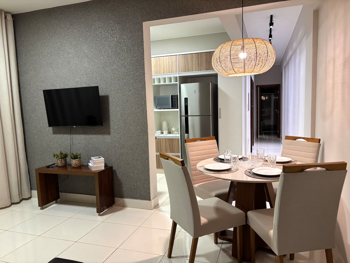 Apartamento no edifício Bandeirantes no centro da cidade, próximo ao jóquei Clube, suíte com cama de casal e ar condicionado, 2 quartos com cama de casal e ar condicionado, 2 banheiros social, cozinha com fogão, geladeira e armário, sala ampla com televisão e mesa de jantar, panelas, pratos, talhares e copos. Acomoda até 6 pessoas.