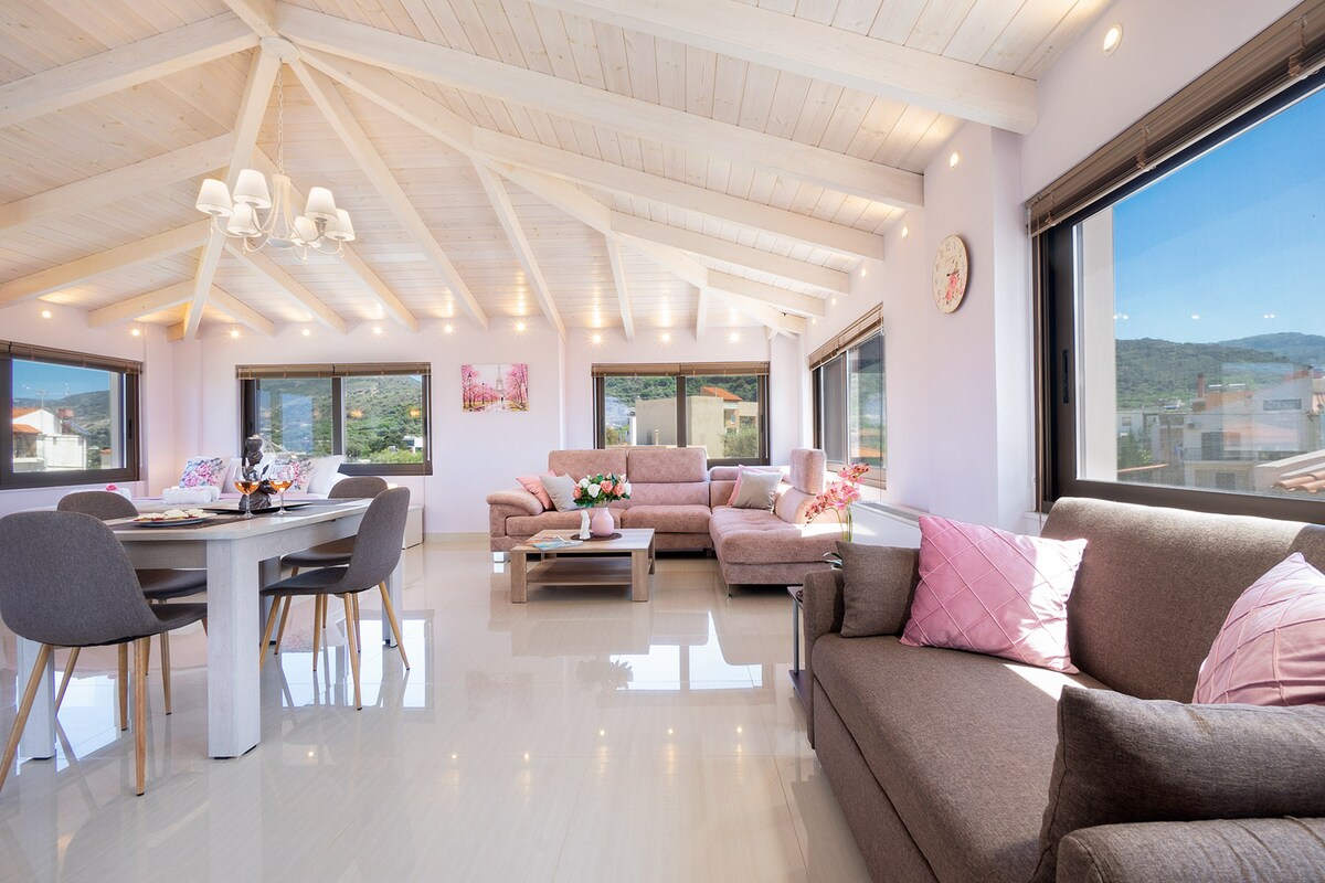 Kappa Residence is a modern 3-bedroom penthouse with a private heated Jacuzzi. It is located in the center of Chania, just 150 meters from the old town, and 1200 meters from the nearest sandy beach. A charming private terrace with a heated Jacuzzi, sun loungers, and a shaded dining area is offered. Inside, an open-plan area, three bedrooms and two bathrooms are provided. Surrounded by cafes, restaurants, and boutique shops, Kappa Residence is a lovely retreat for families and friends.