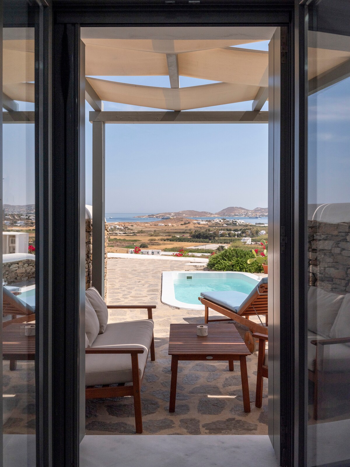 Sueno sunset villa for 2 is located in a nice area which combines beautiful sea-views,it is part of a complex consisting of 5 other apartments,It is 2,3 kilometers from the port of Parikia .The old town, the shops and the night life are 1200 meters away. It is 33 square meters and has a fully equipped kitchen, 1 bedroom, a living room, 1bathroom and veranda with jacuzzi is not heated. You deliver it clean with sheets and towels and there is not a service include during your stay.