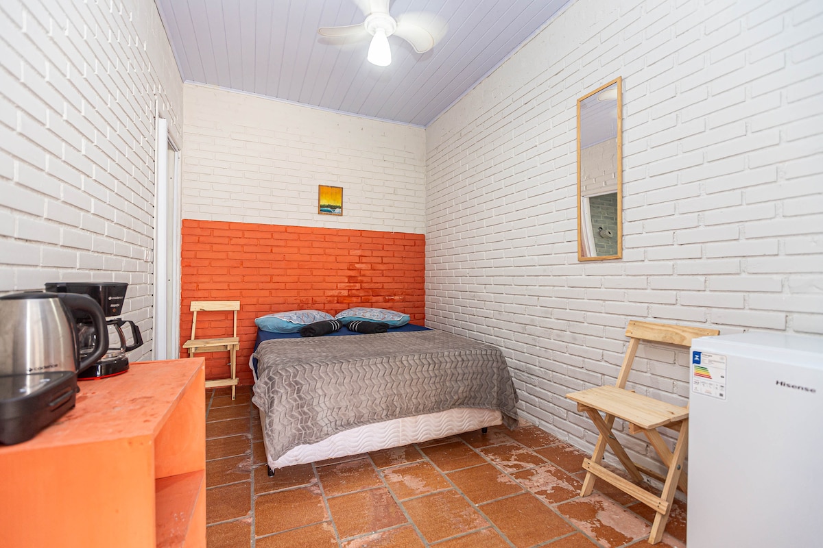Relaxe neste lugar único e tranquilo a apenas 160 metros da praia. ☀️🏖️🌊 Suite com cama casal, roupa de cama, ventilador no teto, banheiro exclusivo, frigobar, cafeteira, sanduicheira, chaleira elétrica, espaço para refeições e rede. Check-in e check-out flexíveis!