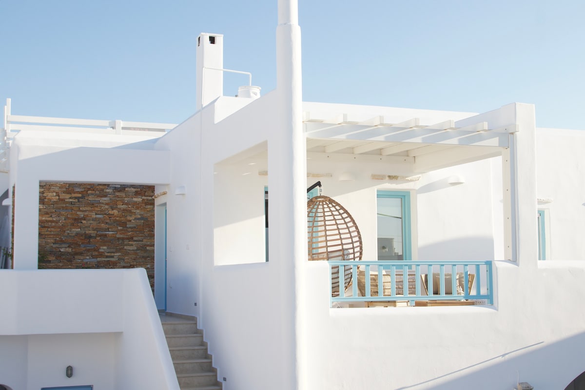 Moderna Kiklādu stila dizaina un ērta māja ar neticamu gaismu un iespaidīgiem skatiem, kas atrodas privileģētā vidē ar vienu guļamistabu un lielu terasi! Māja atrodas 2 km attālumā no Naksas pilsētas uz kalna, no kuras paveras elpu aizraujošs skats uz Naksas līci. Šī mājīgā māja piedāvā visu jūsu brīvdienām! Māja ir būvēta uz milzīgas klints, un jums ir dārzs, ļoti liela terase ar grilu, pergolas, būvēti dīvāni un savs mini baseins! Ieteicams no Conde Nast ceļotāja!