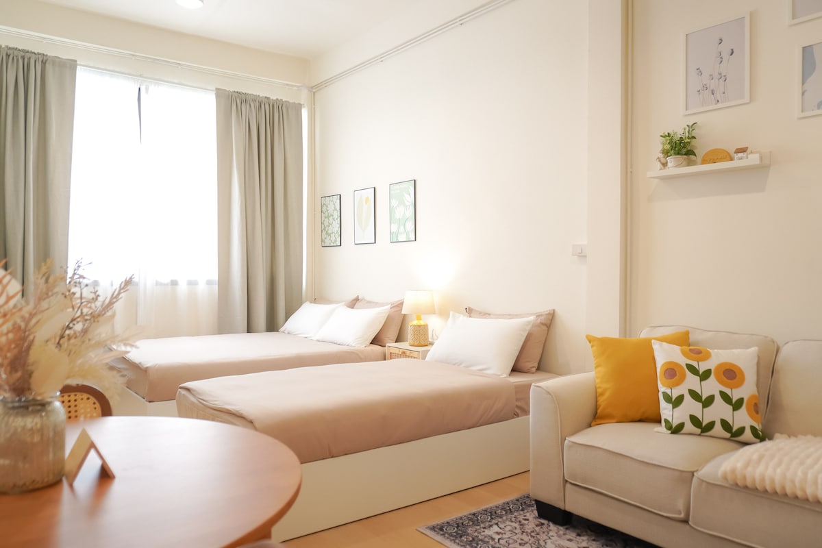 🏡Step into a Renovated Designer Loft that blends industrial charm with warm modern comfort, perfectly located just 1 minute from BTS Ratchathewi and 5 minutes from Siam, MBK 🏡This spacious 50 sqm studio features exposed brick walls, and 2 queen-size beds for up to 4 guests. Relax in the cozy lounge area, enjoy Netflix on your Smart TV 🏡 Designed for families, couples, and groups, this loft delivers comfort with home-like warmth — a true Bangkok retreat where design meets location
