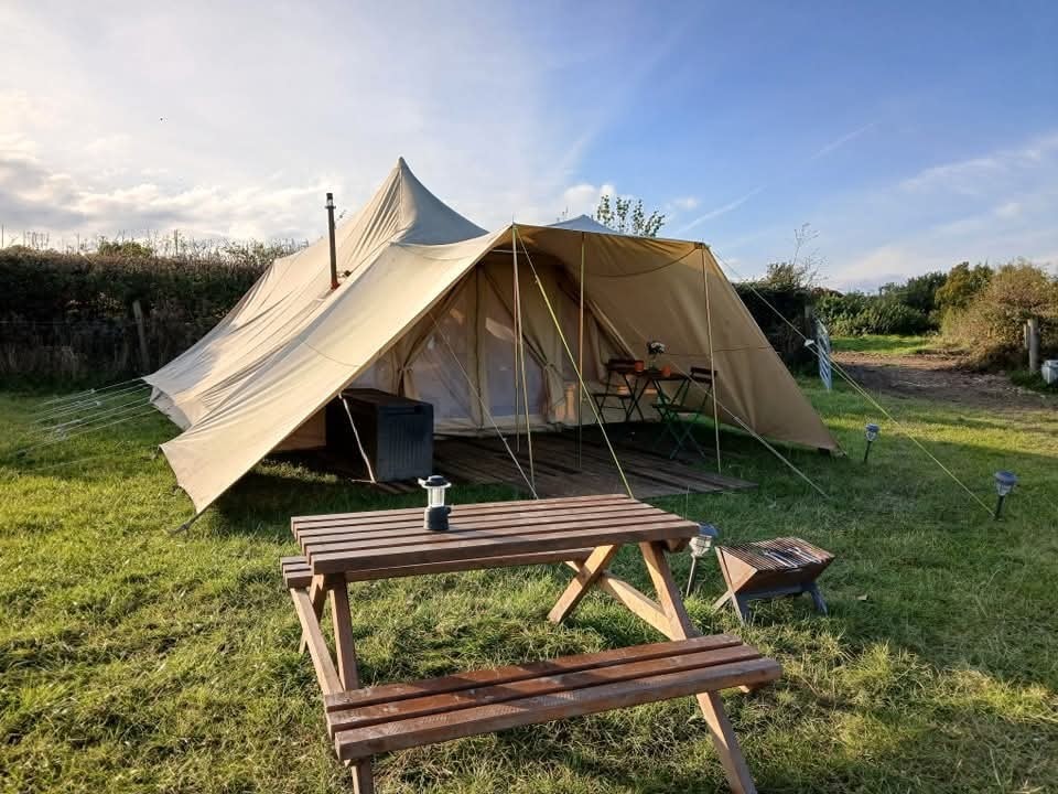 Escape to the great outdoors without sacrificing comfort in our beautifully furnished 5 - meter bell tent. Nestled in a quiet part of the site, and with incredible views this glaming experience offers the perfect balance of rustic charm and modern amenities. the bell tent is on part of south view farm pop up campsite Our bell tent has a double bed sleeps 2 but additional guests are welcome at a little extra cost we provide two single comfy camp beds guests just need to bring there own bedding