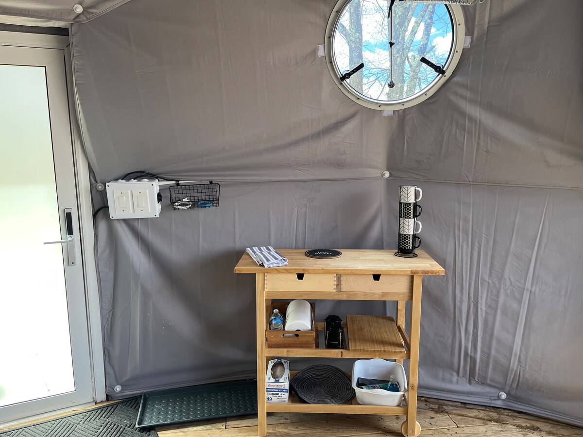 Izbaudiet izcilu tradicionālo kempingu mūsu Dome Tent Double viesnīcā The Ferncrest, kas atrodas pašā Pocono kalnu sirdī un tikai dažu minūšu attālumā no Apsolītās zemes pavalsts parka. Šī mājīgā atpūtas vieta ir pārdomāti iekārtota atpūtai un saiknei, un tajā ir silts interjers, kvalitatīva gultasveļa un lauku stila detaļas ar privātu piekļuvi burbuļvannai. Tā ir ideāla vieta, kur atpūsties un atjaunot spēkus dabā.