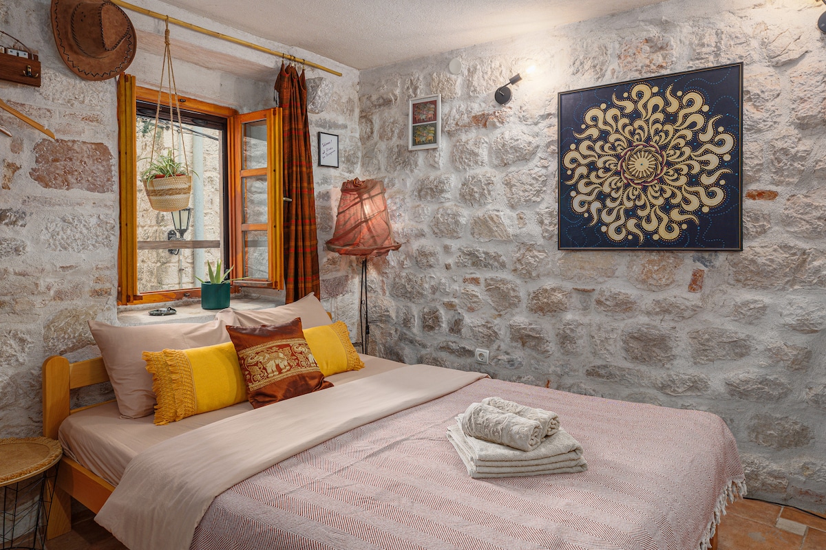 Tieši Kotoras vecpilsētas pasaules mantojuma vidū, kāpiet 54 pakāpienus līdz šai apbrīnojamai studijai ar privātu dārzu un terasi, no kuras paveras satriecošs skats uz jumtiem, apkārtējiem kalniem un jūru. Visas sienas ir atsegtas ar akmeni vai akmeni un mīļi restaurētas. Virtuve ir labi iekārtota un iekārtojums ir moderns, viegls un ērts. Vecais satiek jauno.