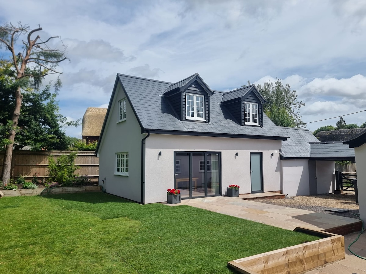 A newly built, light and airy detached en-suite room above a double garage, with its own private entrance, in the grounds of our period thatched cottage. In a charming village, and our own one acre mature garden, the room has its own private elevated deck with a table and chairs. There is also access to the garden and other seating areas and summer house. There is a super delicatessen close by. There are 2 pubs approx 10 min walk, and another in next village about 2 miles away.