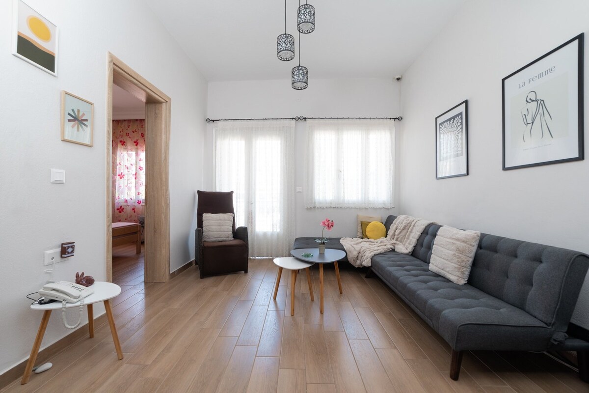 Šis centrālais dzīvoklis piedāvā patīkamas naktsmītnes pašā Katerini centrā, blakus supertirgum, aptiekai, restorāniem, bāriem un veikaliem, kā arī laukums tikai dažu soļu attālumā. Tajā ir bezmaksas Wi-Fi, aprīkota virtuve, ērta guļamistaba ar divguļamo gultu un viesistabā ir trīsvietīgs dīvāns, kas kļūst par vienguļamo gultu. Kafijas baudīšanai ir arī balkons ar galdu un krēsliem. Ideāla izvēle ģimenei, draugiem, pāriem vai atsevišķiem ceļotājiem.