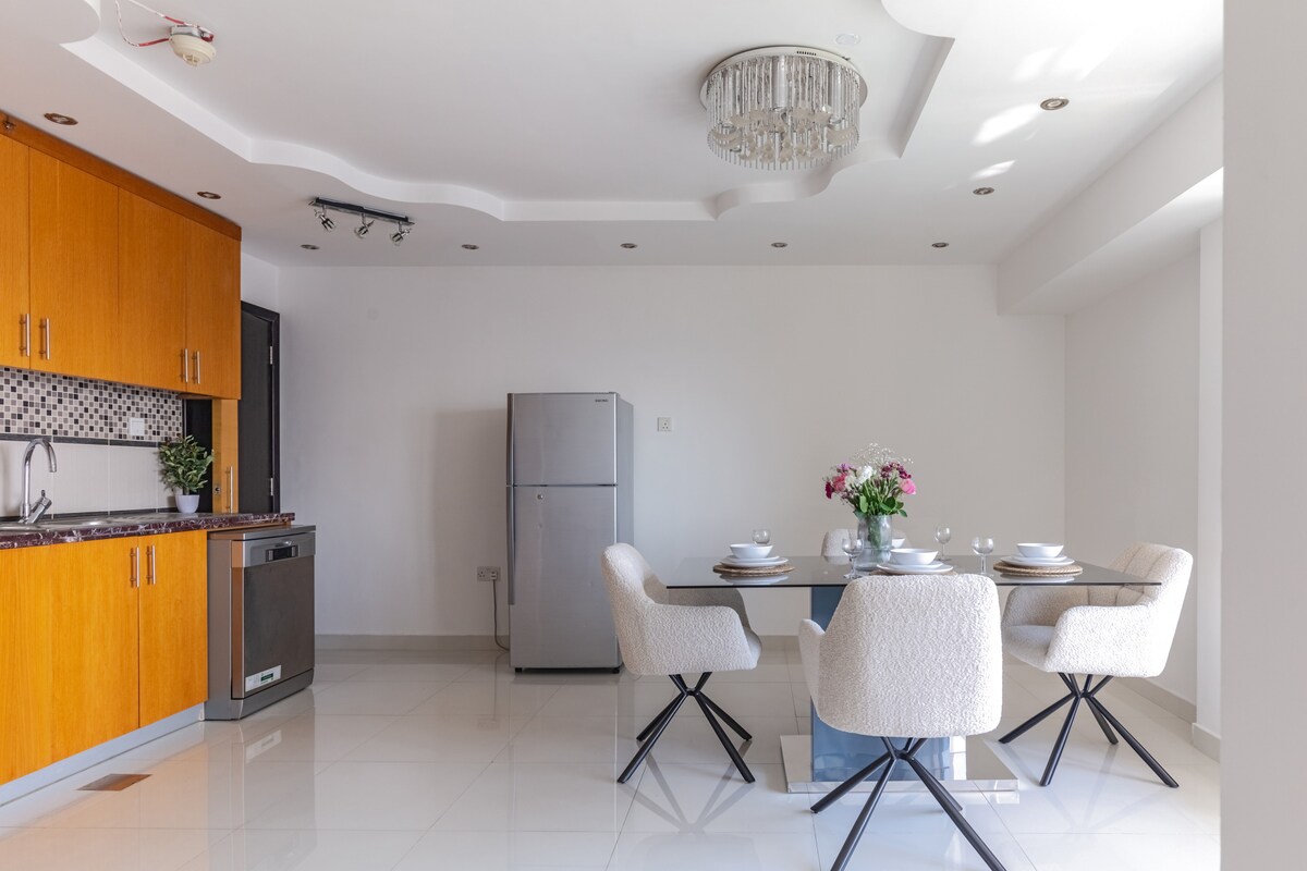 comfortable apartment located in the Al Khaleej neighborhood The apartment offers a calm and relaxing atmosphere with elegant décor and a spacious living area Features Private balcony for a pleasant and relaxing seating area Modern and elegant décor Spacious living area Fully equipped kitchen with all essential amenities Nearby Services Grocery store and laundry within 2 minutes Palm Corniche 3 minutes Fanateer Corniche 4 minutes Important Note No elevator available