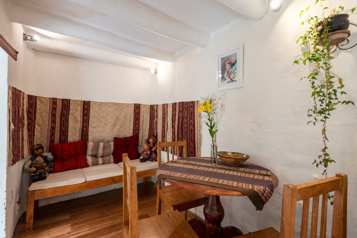 Trīs kvartālu attālumā no Cusco 's Plaza de Armas, tradicionālajā apkaimē San Blas ir Pilnībā privāts un aprīkots mini dzīvoklis ar virtuvi, ēdamistabu,vannas istabu, guļamistabu, kamīnu, logu, neflix, wifi (optisko šķiedru) un terasi mājas dārzā. Tajā ir diennakts pakalpojumi, un tā bauda mieru mežā, kas atrodas aiz saimnieka guļamistabas. Tā ir daļa no tradicionālās koloniālā tipa mājas - zila adobes māja, baltas sienas ar durvīm un ziliem balkoniem