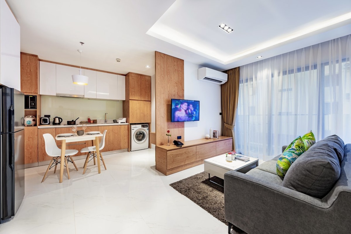 Laipni lūdzam mierpilnajā pilsētas atpūtas vietā. Šis modernais divu guļamistabu dzīvoklis ir paredzēts komfortam, privātumam un atpūtai, ar maigu dabisko apgaismojumu un skaistu skatu uz dārzu un baseinu, kas liek aizmirst, ka atrodaties pilsētā. Pārdomāti iekārtotais un gaumīgi iekārtotais dzīvoklis piedāvā plašu telpu ģimenēm, pāriem vai draugiem, kas ceļo kopā. Neatkarīgi no tā, vai esat šeit darba vai atpūtas nolūkos, šis ir mājoklis, kurā varat patiesi atpūsties.