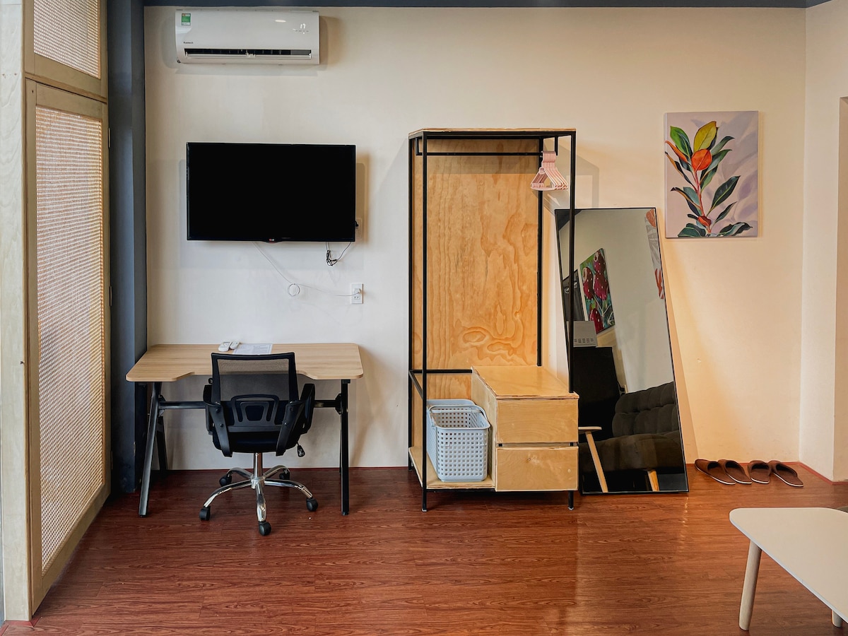 101. numurs ir ērta studijas tipa ēka, kas atrodas lieliskā vietā, 3 minūšu attālumā no lidostas un 10 minūšu attālumā no centra. - Istaba ir iekārtota japāņu stilā ar pilnu dabisko apgaismojumu, koka mēbelēm un pilnībā aprīkota ar virtuves piederumiem, lai radītu siltu sajūtu kā mājās. - Atrodas pirmajā stāvā ar savām durvīm, ļoti privāta un viegli ienesama bagāža. - Telpa ir aprīkota ar modernu projektoru, kas aprīkots ar netflix, lai jums būtu viegli skatīties labas filmas, piemēram, mini mājas kinozāli.