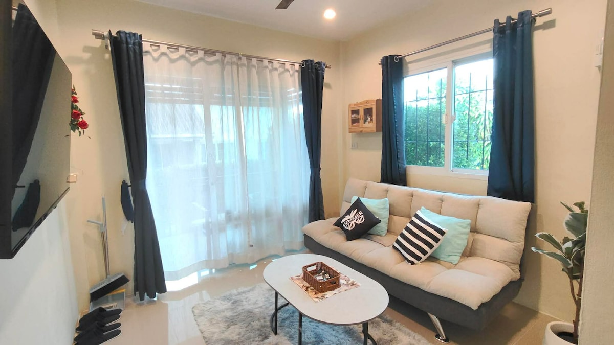 Situated within walking distance to Kamala Beach and directly on the beach road, we offer a 2-bedroom, 2-bathroom upper unit. The property has all the necessary amenities, including a washing machine! It features a full kitchen, a dining area, a sofa, and an outdoor seating space. Restaurants, supermarkets, and other essential services are all accessible on foot, eliminating the need for transportation during your stay. High-speed WIFI, no additional fees for water and electricity!.