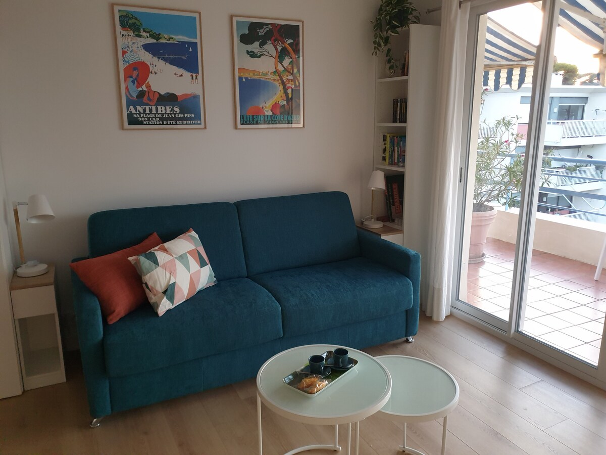Mājīga studija, kas lieliski atrodas krastmalā, no kuras paveras elpu aizraujošs skats uz jūru un Cap d 'Antibes. Jūs to novērtēsiet gan ar tās atrašanās vietu, kas ir vērsta pret jūru, ar tiešu piekļuvi Ilette un Salis pludmalēm, gan gan par tās tuvumu vecpilsētai un tās tipiskajām ielām, tās klintīm, ostu un restorāniem. Atrodoties pastaigā, kas savieno Antibes vecpilsētu ar Cap d 'Antibes, jūs izbaudīsiet klusu uzturēšanos ar kājām ūdenī.