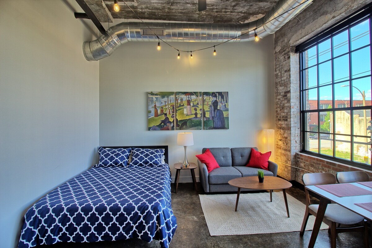 Nash Loft ir satriecoša minimālisma studija ar 12’ griestiem, pilnībā aprīkotu virtuvi ar melnām nerūsējošā tērauda ierīcēm un kvarca letēm, plašu ieejas skapi, saliekamu veļas mazgājamo mašīnu + žāvētāju, dizainera vannasistabu ar melnu nerūsējošā tērauda dušu un bezkadra stikla dušu un spilgtiem 7 collu industriāla tērauda logiem ar skatu uz koku ieskauto ielu un veikaliem zemāk. Atrodoties pa slaveno Lokustas ielu Midtaunas sirdī, jūs būsiet soļu attālumā no COVIDU, Wells Fargo, BJC un Grove.
