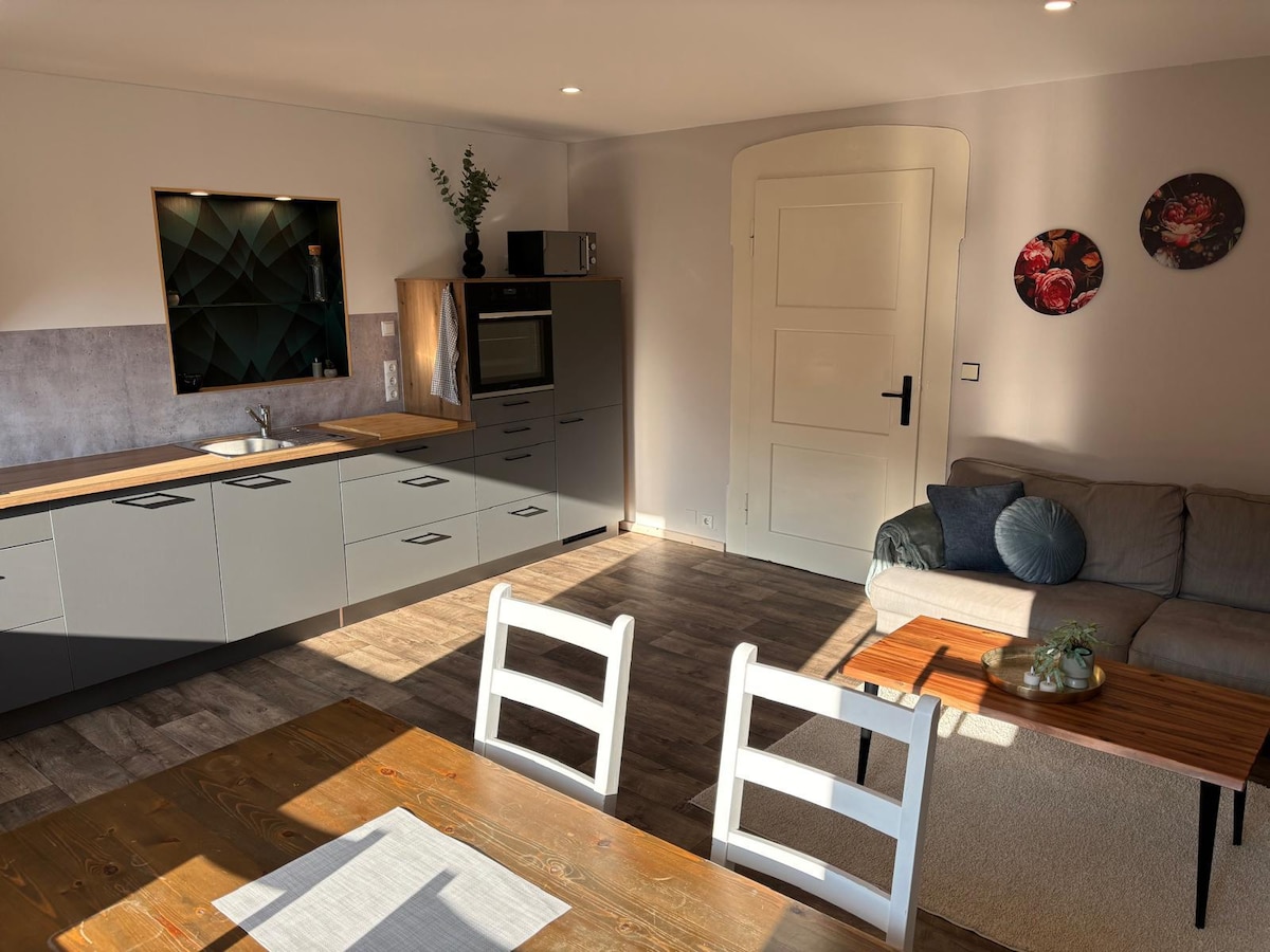 Veca un jauna apvienota, skaistā, vecā rindu mājā Rīsenbahas centrā. Dzīvoklis atrodas 2. stāvā un sastāv no apvienotas dzīvojamās/ guļamzonas, virtuves, vannasistabas un atsevišķas tualetes. Otro guļamistabu var izmantot, rezervējot no 3 cilvēkiem. Dārzs aicina jūs atpūsties. Neuberinhaus atrodas 1 minūtes pastaigas attālumā. Apkārtnē ir pieejama autostāvvieta.