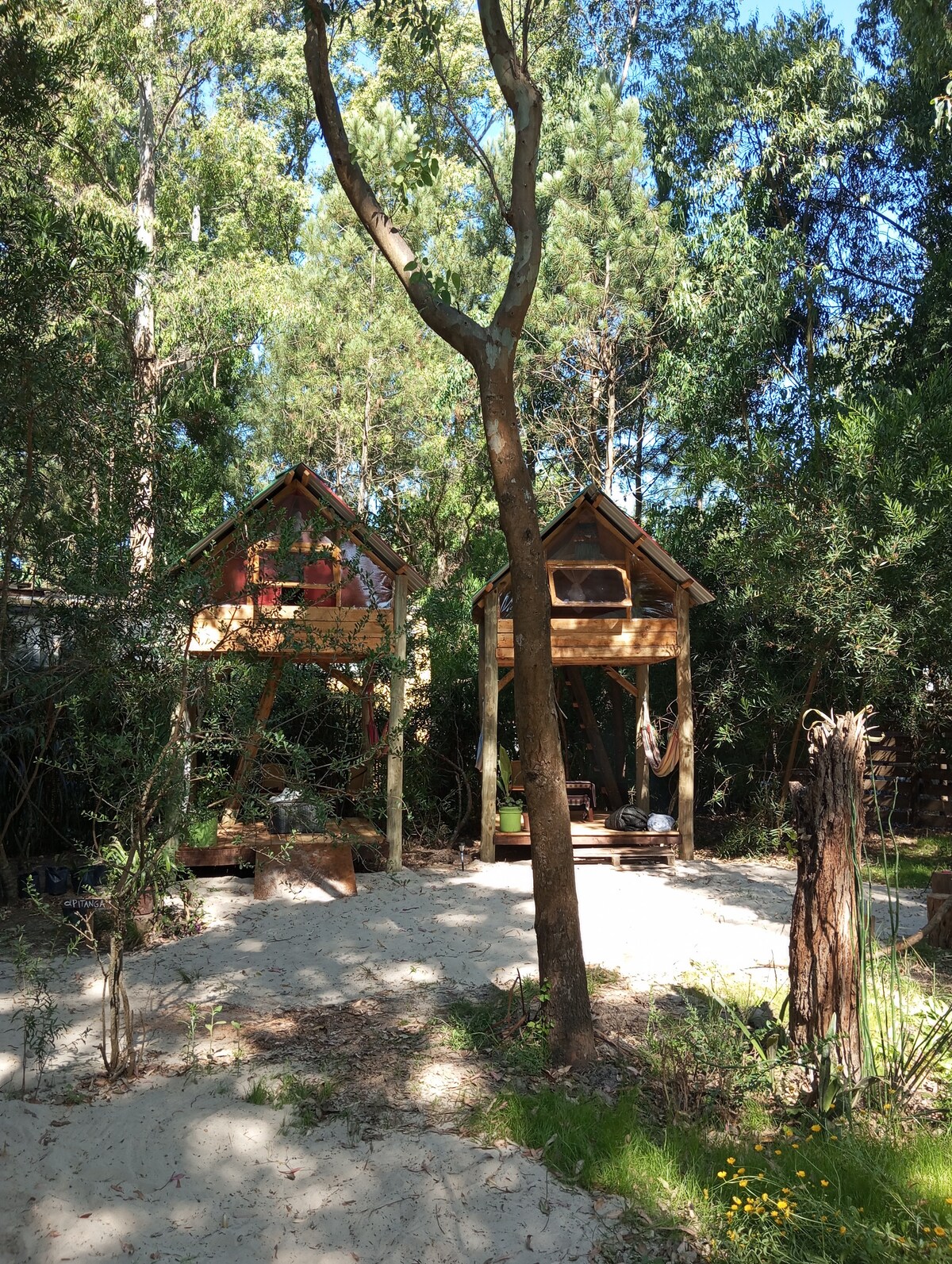 La Locanda dispone de cuatro casitas distribuidos en un jardín arbolado. Cada una de ellas cuenta con dormitorio, baño, cocina y jardín de invierno. Ubicada en una zona tranquila, frente al monte de de San Vicente y a pocas cuadras de la playa, a la que se puede llegar en 10 min caminando. Las construcciones son artesanales realizadas por Adri y Tato cuenta con interiores en barro y techo vivo, estos le ofrecen al interior buen aislamiento térmico y calidez. (En lugar hay 1 perros, 3 gatos)