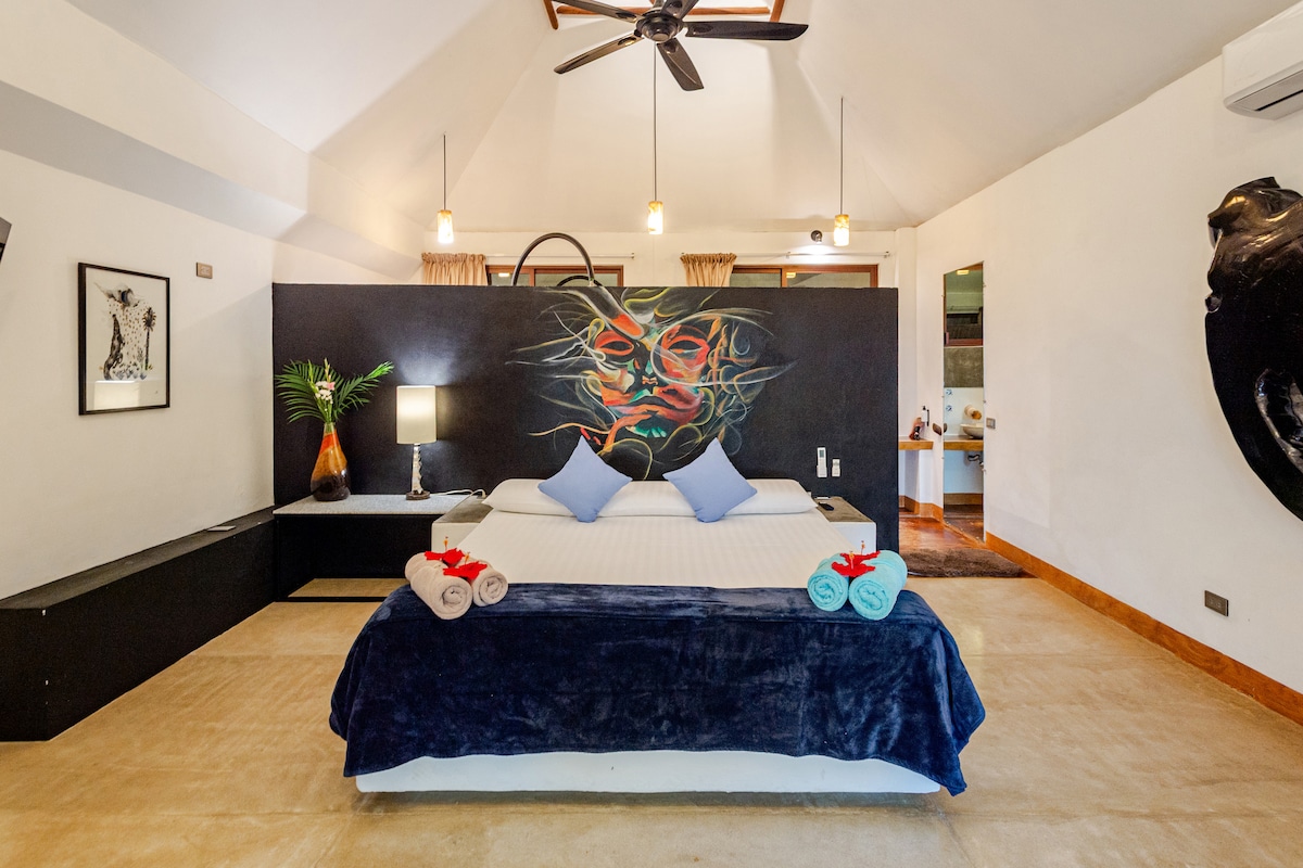 Villa totalmente equipada con cocina, habitación con cama king size y aire acondicionado, baño amplio con ducha espaciosa, alberca privada y una terraza ideal para relajarte. Decorada con un estilo original y detalles artísticos únicos, esta villa ofrece un ambiente de tranquilidad, privacidad y confort. Perfecta para parejas que buscan una escapada especial.