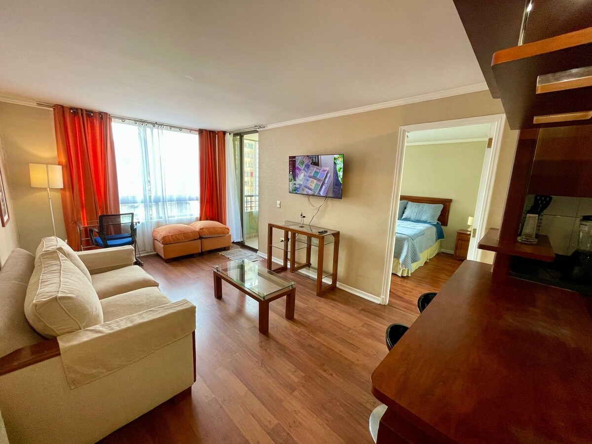 Furnished apartment with excellent location near supermarkets , just 1 block from the Santa Lucia Metro and 20 minutes walk from downtown Santiago, excellent connectivity and access. With separate room, bathroom en suite, two Smart TV, kitchen, oven. Work area with desk plus lamp and chair with excellent speed wifi. Terrace to smoke or enjoy the outside Air Conditioning INVERTER 12000 BTU. - supermarket just blocks away. - Café just 300 metres away. - Cerro Santa Lucia at only 800 meters.